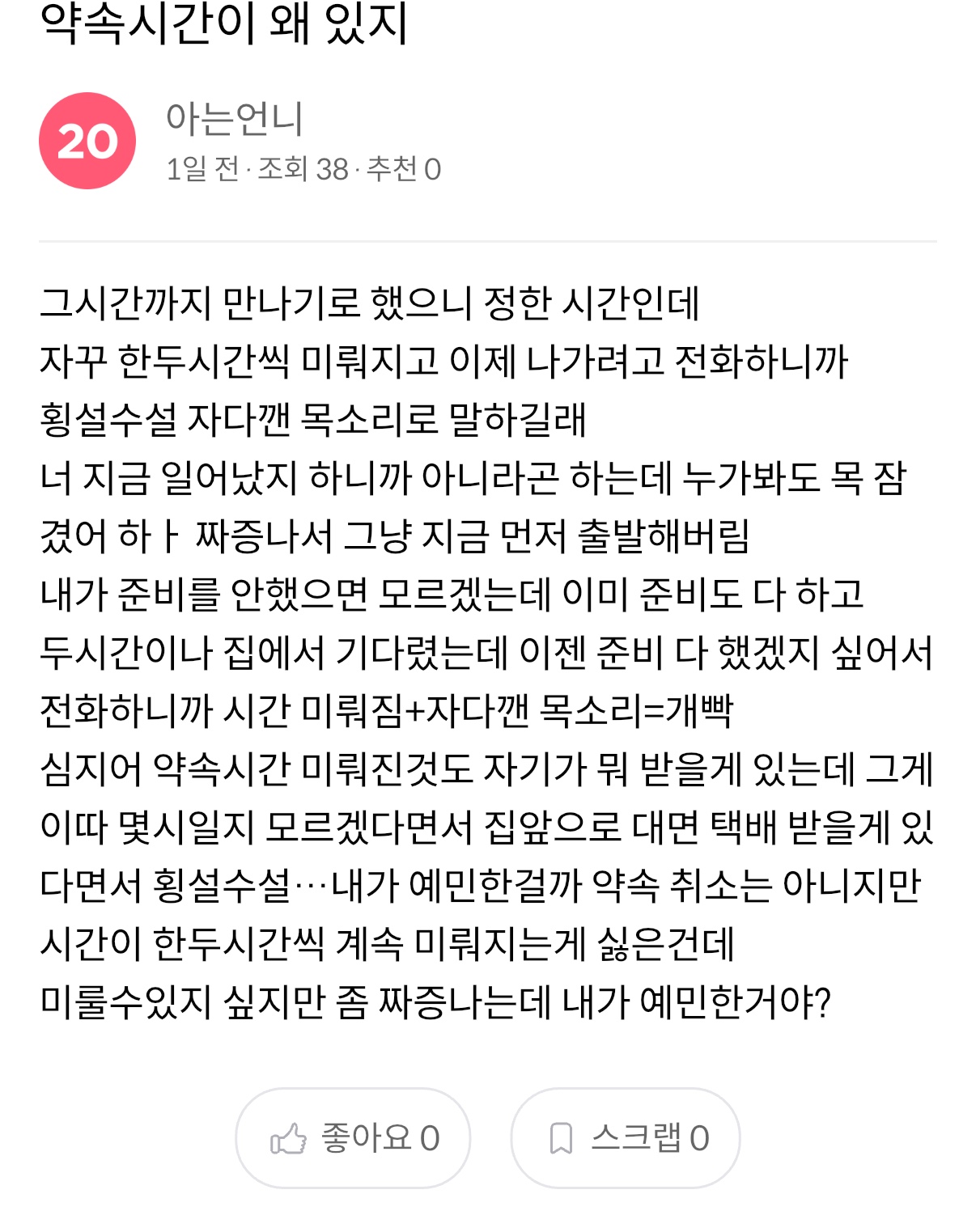 글쓴이@아는언니1 ㄴㄴ 방금 카톡으로 늦어서 진짜 미안하다는데 미안한거 알면 어제 자각하고 오늘 쳐늦지를 말아야지 미안하단말로 그냥 다 끝인가