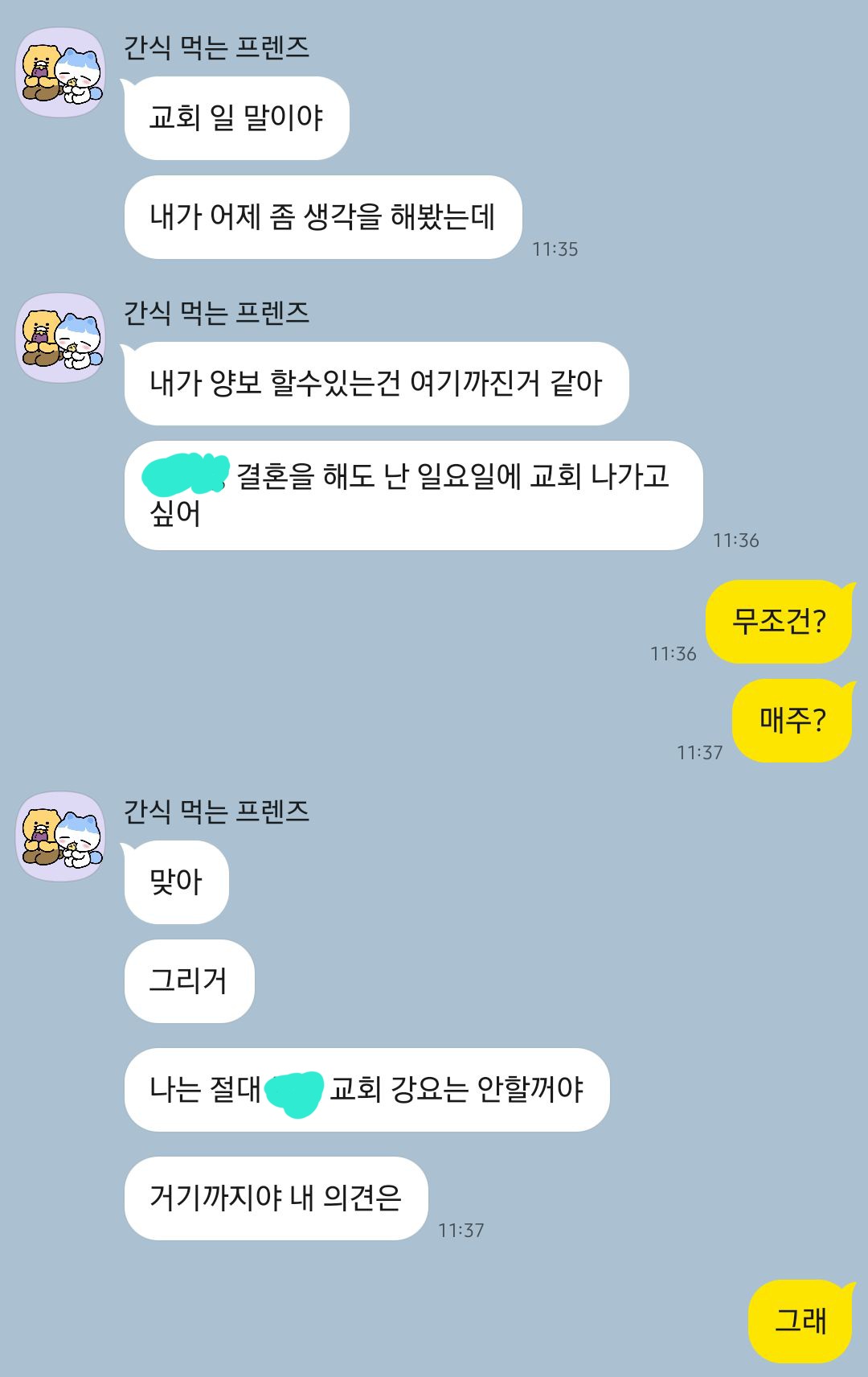 나중에 2세문제도 나는 애기는 일단 교회 절대 안보낸다. 니까지는 교회가는거 오케이지 애기는 안보낼거다 못박아둔 상태고 그거에 대해선 아직 별말은 없어.