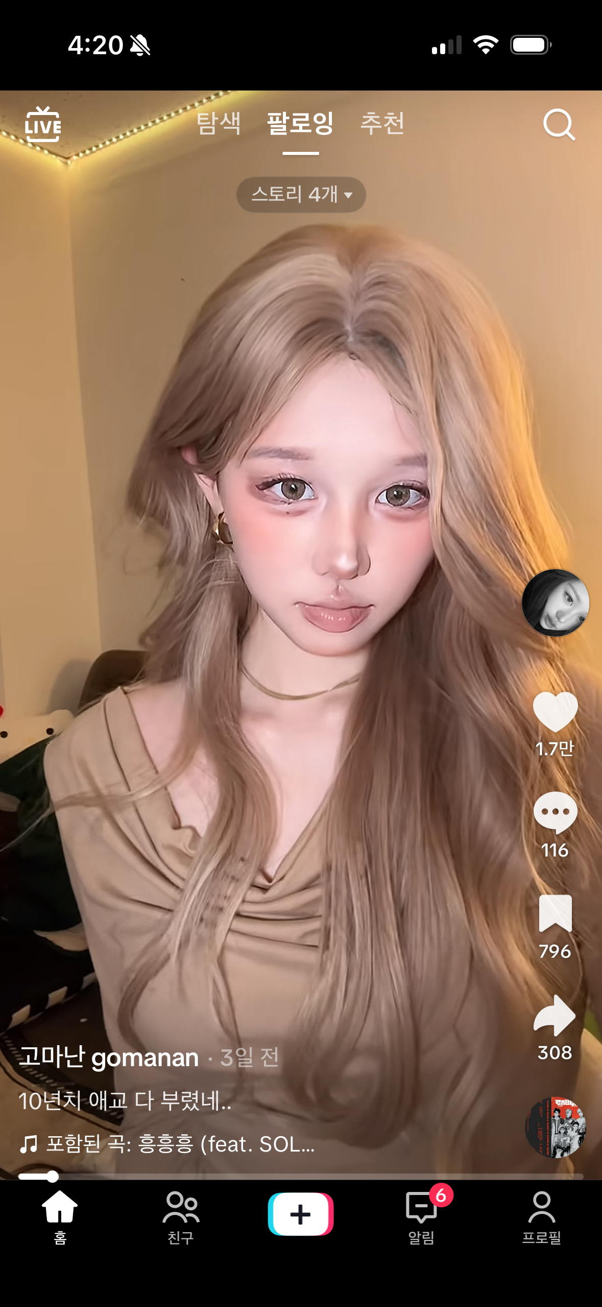 내가 원래 화장 꿀팁같은거 알려주시는 틱톡커는 팔로우 해놔서 고마난님도 팔로우 하고 있기는 했단말야?