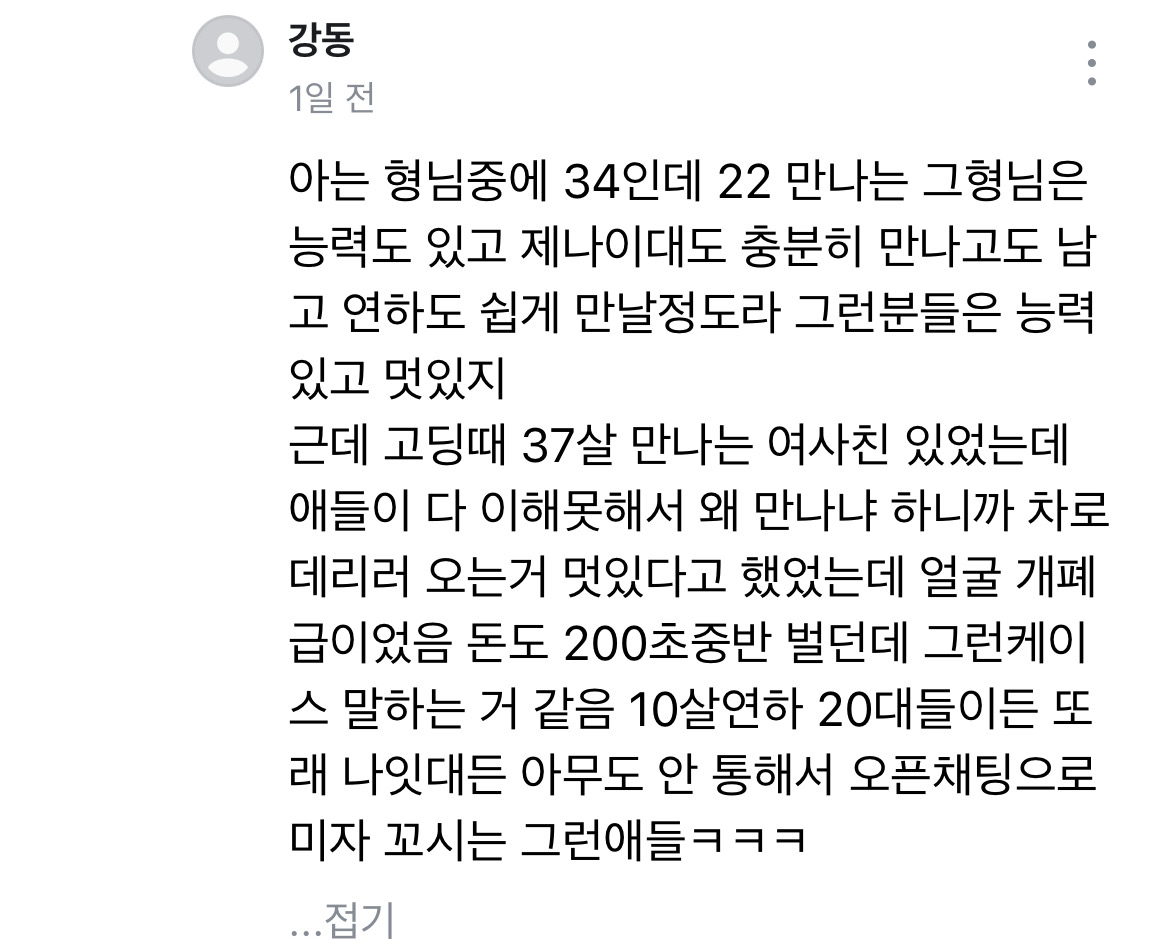 글쓴이@아는언니1 저렇게 댓글 단 애들은 하는말이 또래들이 채가는게 아니라 능력있는남자가 또래를 만나주질 않지 왜 같은비슷한나잇대 만나는걸 정상이라 하고 미자 만나는걸 비정상이다 반대로 얘기하녜