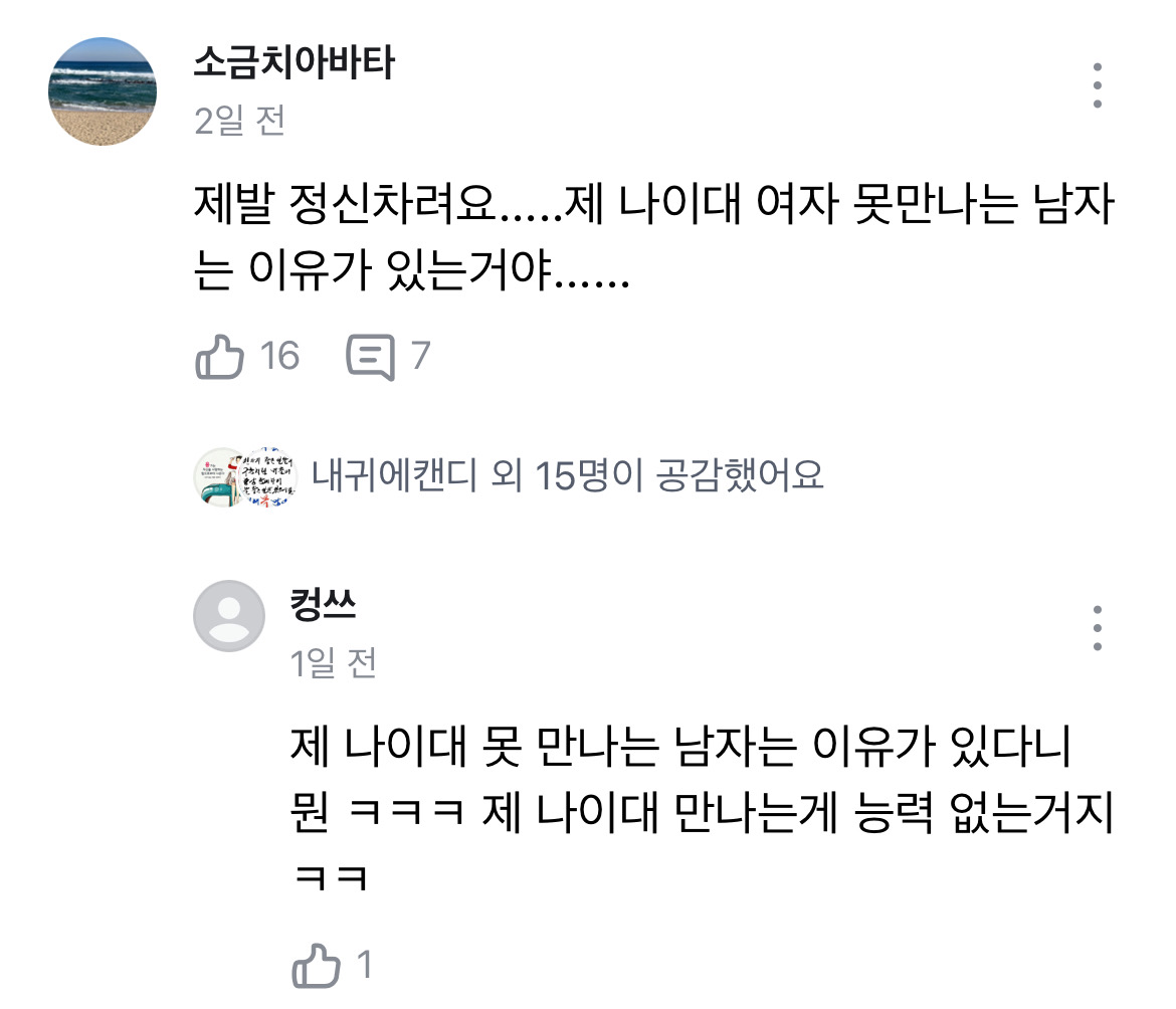 아ㅋㅋㅋ당근 고민있어요 모임? 거기에 나도 있는데 방금 보고왔는데 몇몇은 남자가 능력있네~ 이러고있어서 당황스럽다… 이댓글도 50대신데 뭐가 이상하냐하는거 역하네
