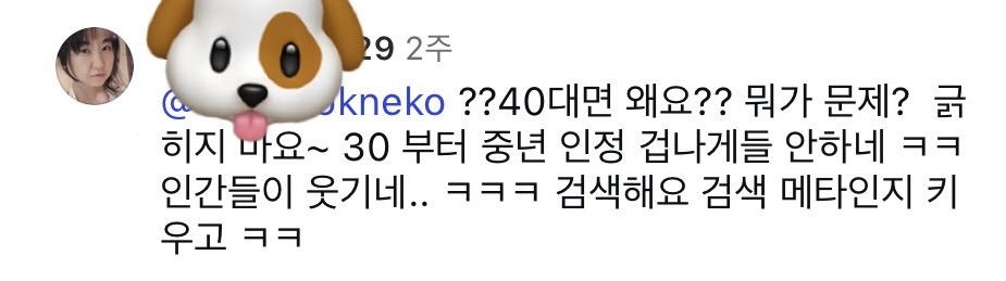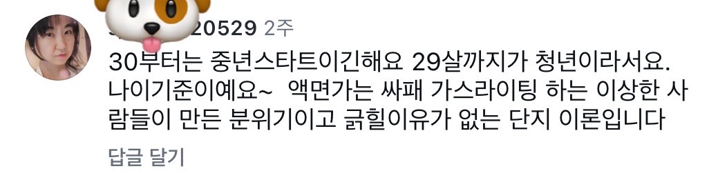 맨아래쪽 댓글 보니까 40대면 왜요?? 하는 거 보니 저분이 40대 같은데 나만 중년취급 받기 싫어서 30대도 끌어내리는거 아닐까…ㅋㅋㅋ