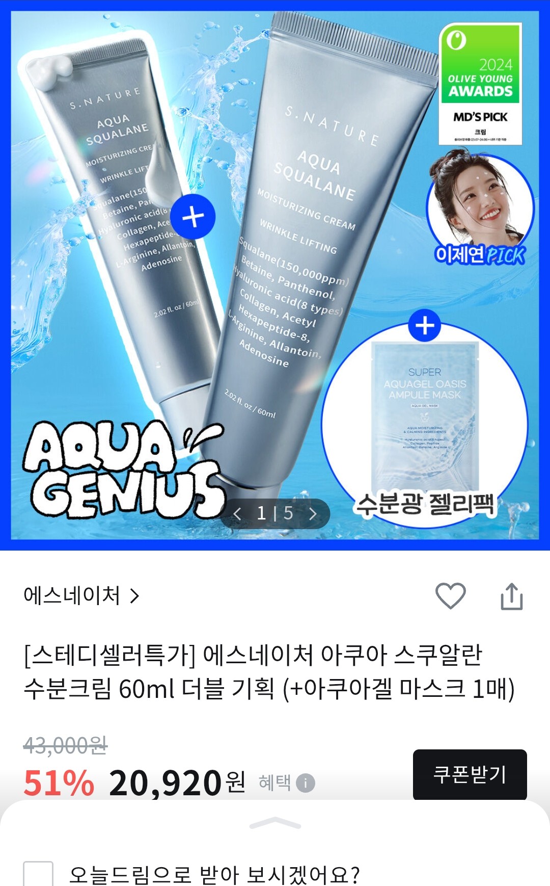 🧴 에스네이처 아쿠아 스쿠알란 수분크림