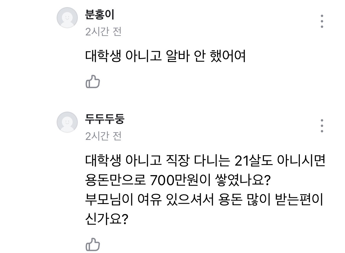글쓴이@아는언니1 그것도 알바 아니양?? 용돈도 안 받고 알바도 안 했어여 라고 써있어가지궁