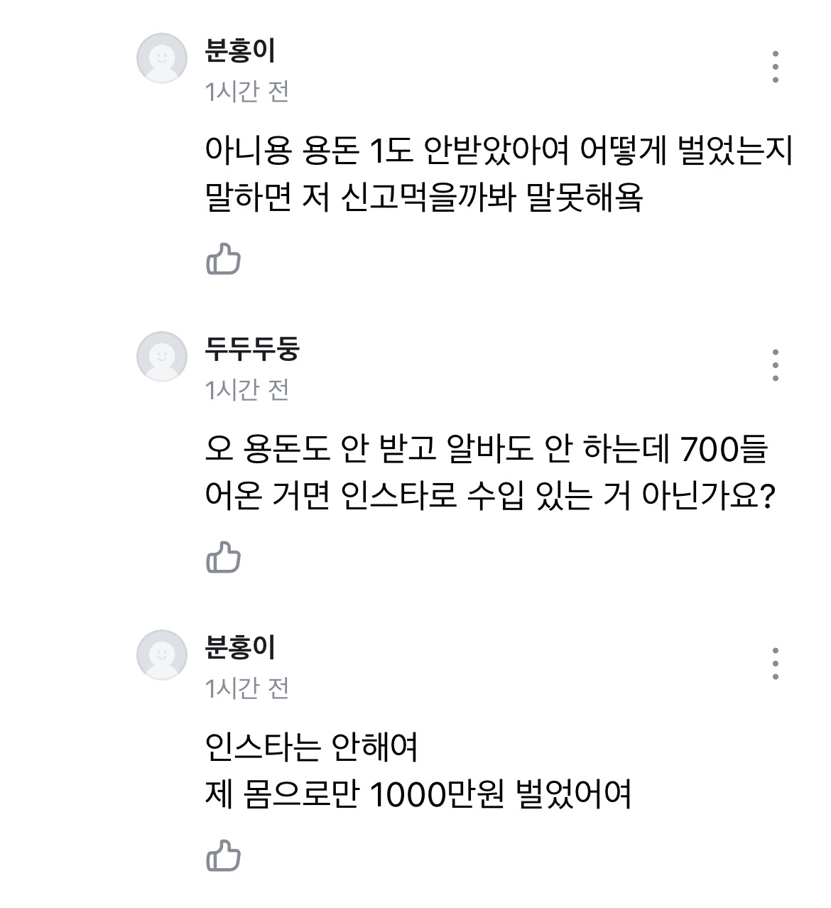 글쓴이@아는언니1 진짜 제 몸으로만 1000만원 벌었다는게 그뜻 맞을까..? 너무 당당히 말해서 다른방법의 수입이 있나 하고 궁금했는딩..