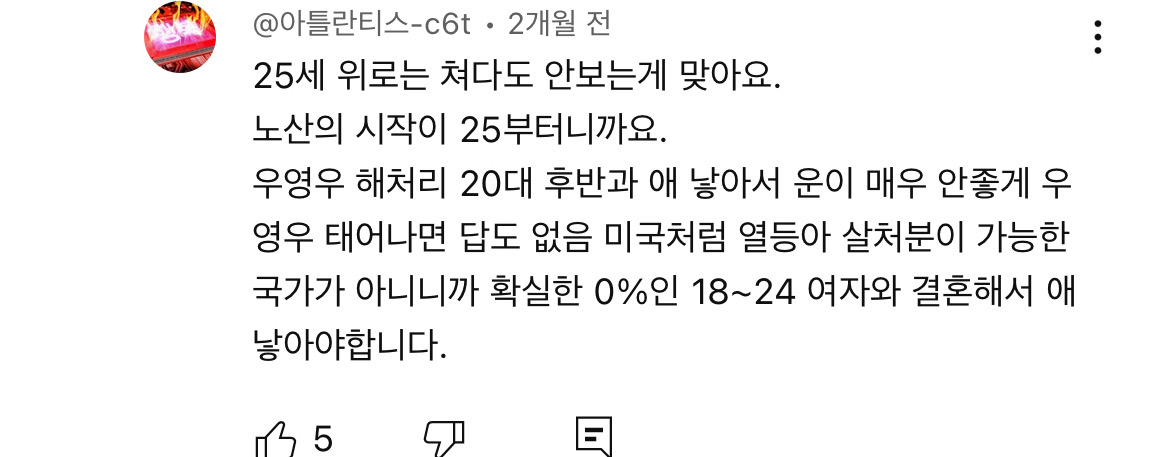 에바임 유튜브댓글 요즘 갈라치기 심함 70년대기준으론 다 20살이면 결혼했는데 지금 평균초혼연령이 32세인데 25여자부턴 쳐다도보지마라 이러고있네,,