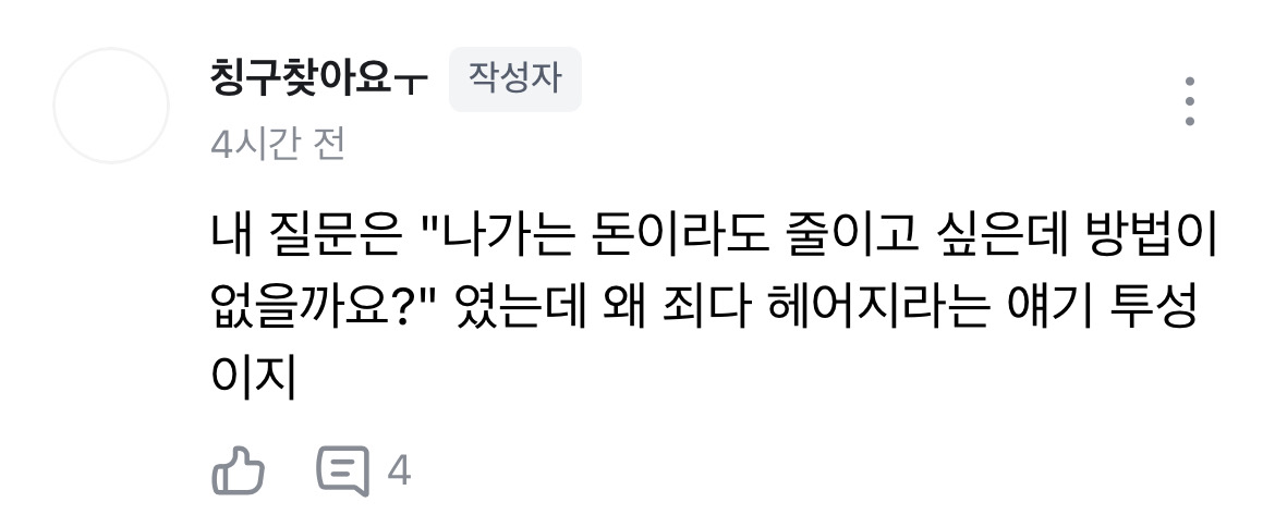 글쓴이@아는언니3 웅 왜 돈을 아낄 방법을 얘기 안 해주고 헤어지자는얘기만 하세요? 하길랭 그럼 남자단점 저렇게 나열하기보다 지출만 쓰고 돈 얼마 아낄지 적어야 할 거 같은데에..