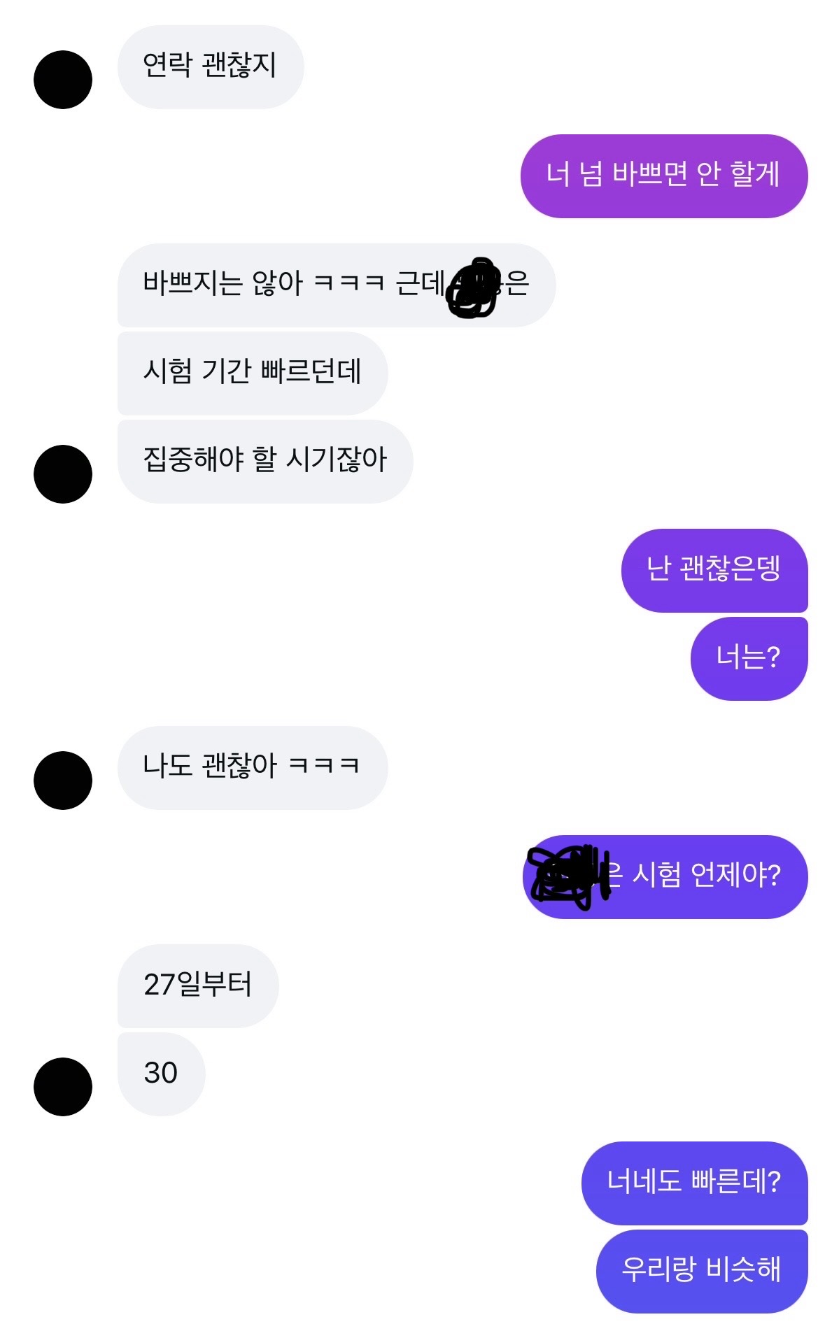 @빠른언니2 시험기간이라 조금 걸리긴 하겠다..아무래도 공부해야하고 하니깐 낼 머하냐고 하고 공부 열심히 하고 나중에 연락해! 이런식으로 보내도 괜찮을듯! 그리고 그냥 밥 챙겨 먹고 해라 이런식으로? 넘 걱정하지 말어 그리고 너무 마음 다 주지말고 일단 천천히 친해진다고 생각해바 나도 첨브터 마음 크게 줬다가 상처 많이 받아써 ㅜ