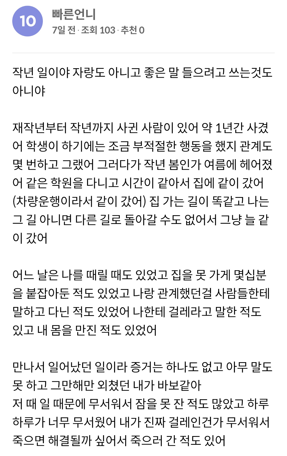 만나고 집 들어가기 전에 내 팔을 끌고 아파트 제일 높은 층으로 가서 내 몸을 만진 후에 억지로 넣고 관계를 한 적이 있어 싫다고 했는데도 계속 한 적도 있어 그런 것 때문에 집에도 늦게 간 적도 많아