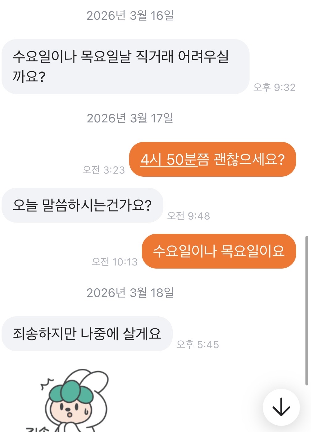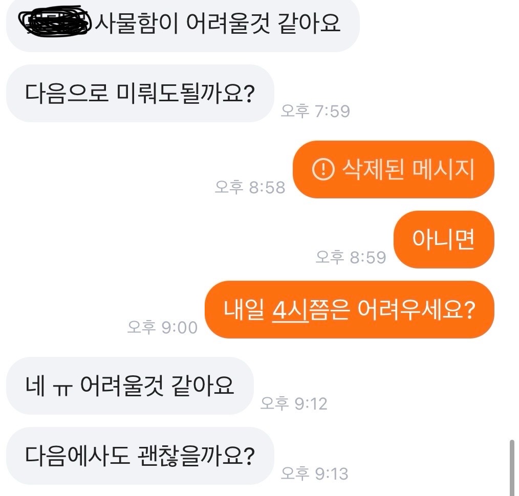 16일(월)에 다시 먼저 연락하시더라고 그래서 내가 17일(화)에 시간 얘기하니까 오늘~~~?라고 물어보시길래 내가 수,목 말한거라고 말했는데 18(수)에 또 나중에 산다고하고~
