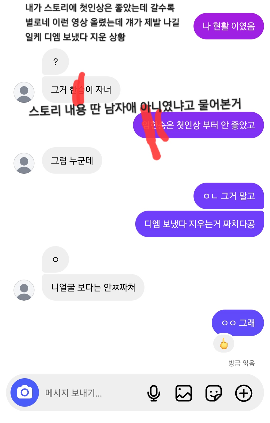 먼저 스토리에 저격 영상 올린건 잘못이긴한데 잘 대처 한건지 모르겠네.. 같은반인데 내일 얼굴 어떻게 보냐.. 저번에 얘가 패드립하고 눈 작다고 어디쪽 유전이냐고 막 이런말 했던 애라서 크게 상관안 쓰기는 한데 이번 일은 좀 거슬려서ㅜ
