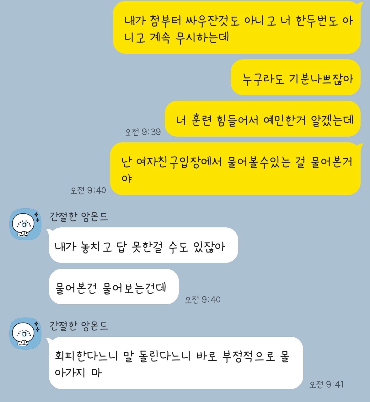 글쓴이@아는언니1 맞아 불과 저번주에 자기가 물었을때 내가 못들어서 답 못했더니 기분나쁘댔었어 ㅋㅋ..ㅎ