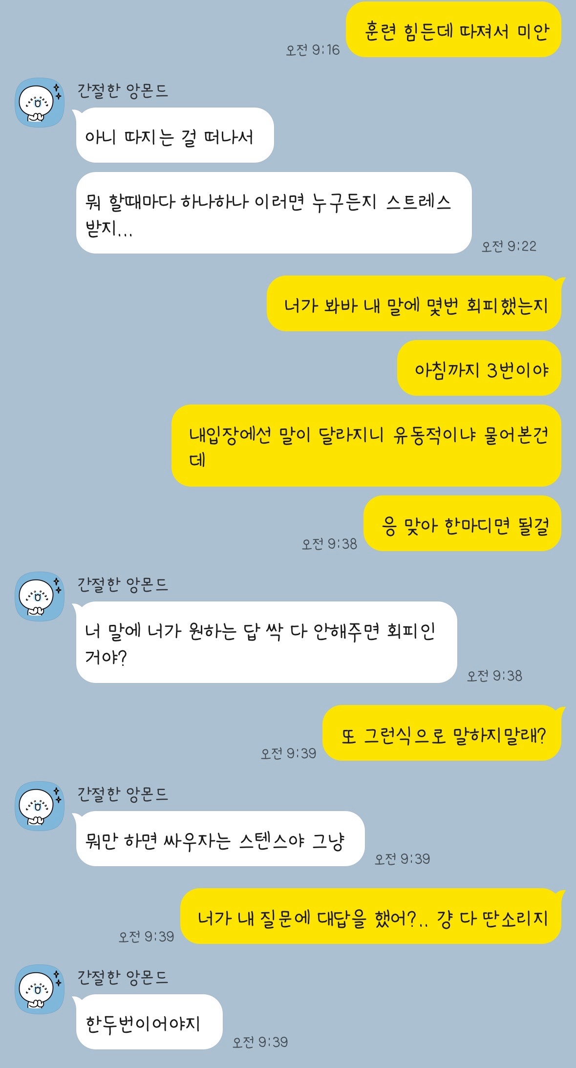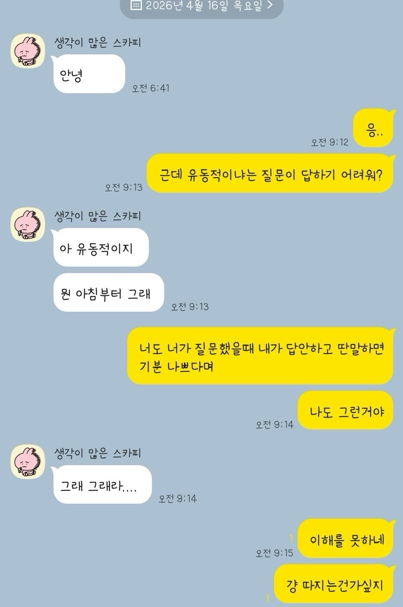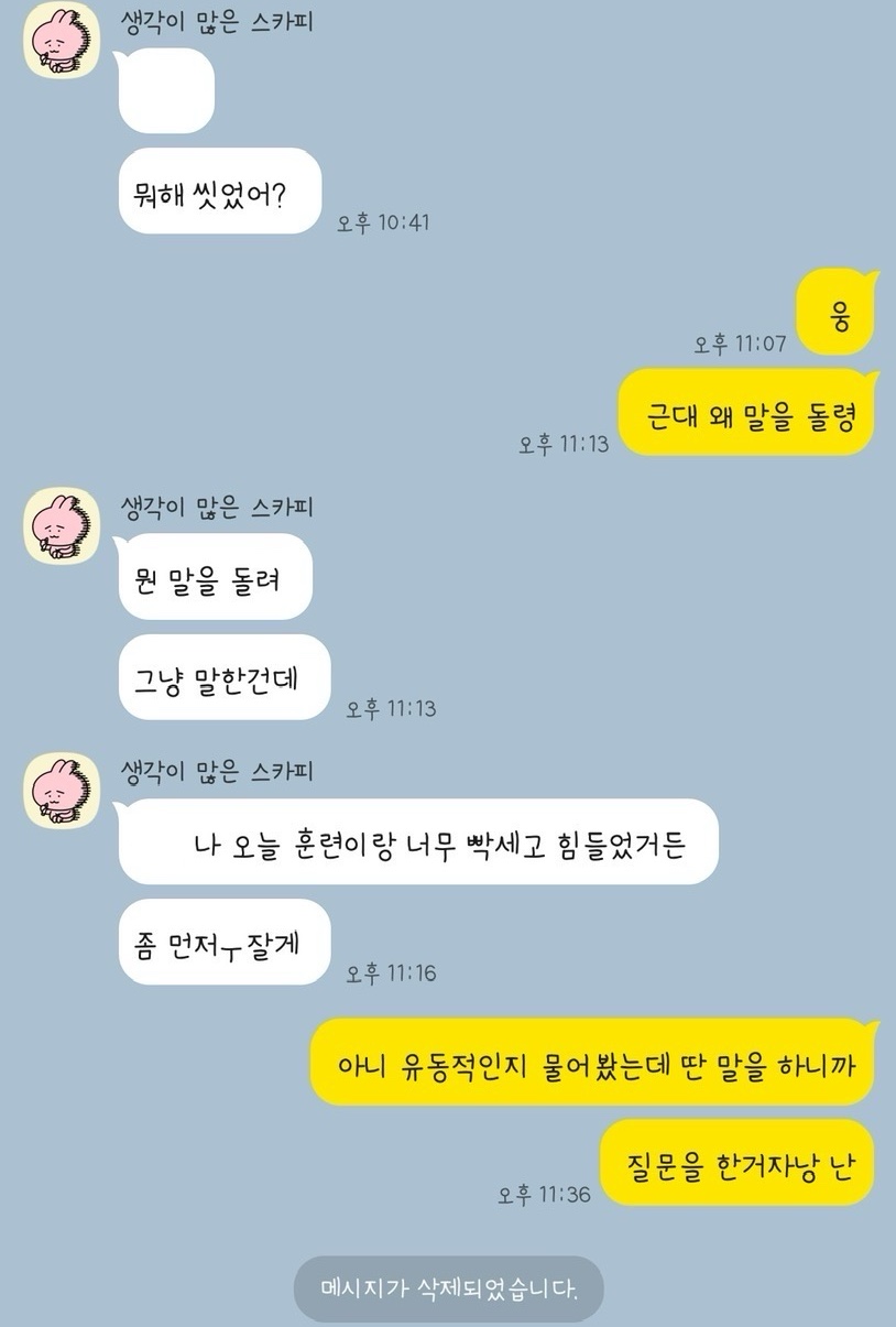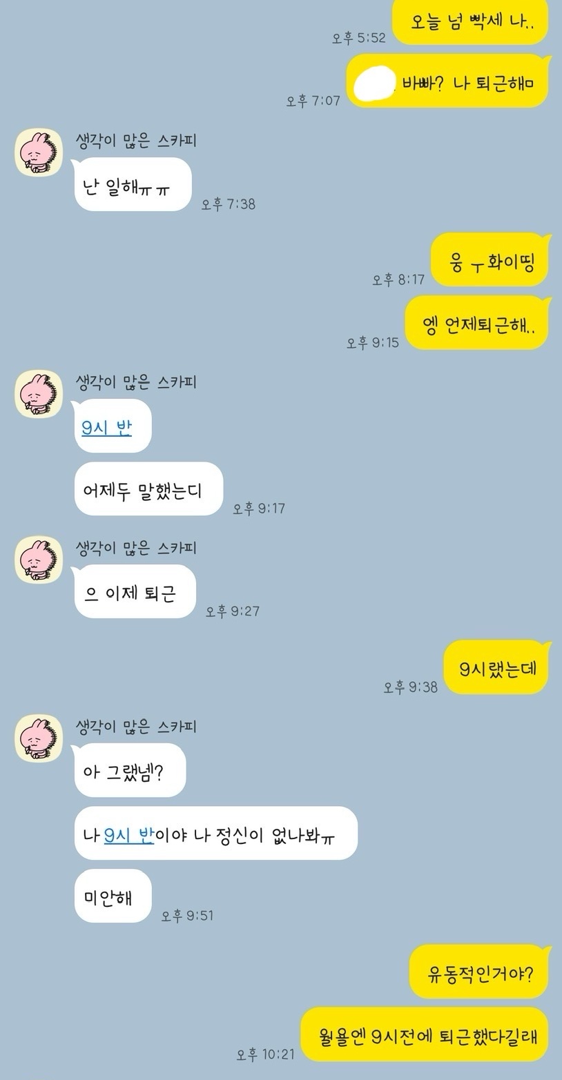 월욜에 2주동안 9시에 퇴근한댔고 그 날 8시56분에 퇴근해! 라고 왔는데 어제는 9시 넘어도 연락없어서 물어보니 갑자기 9시30이래 그러고 퇴근했다길래 그때랑 말이 달라서 유동적인지 물어봤는데 걍 00 뭐해 씼었어? 이러고아침까지 3번을 회피하는게 기분이 넘 나빠서 저렇게 됐어 내가 예민한거야?? 객관적으로 말해주라