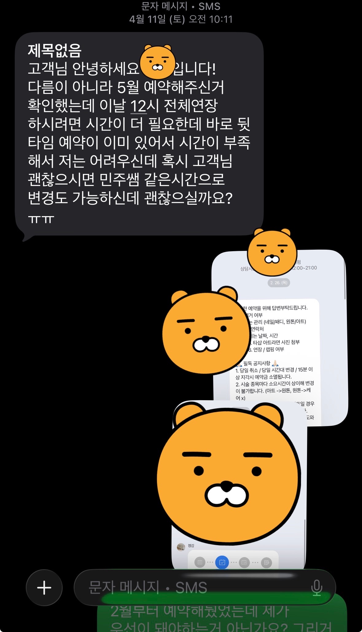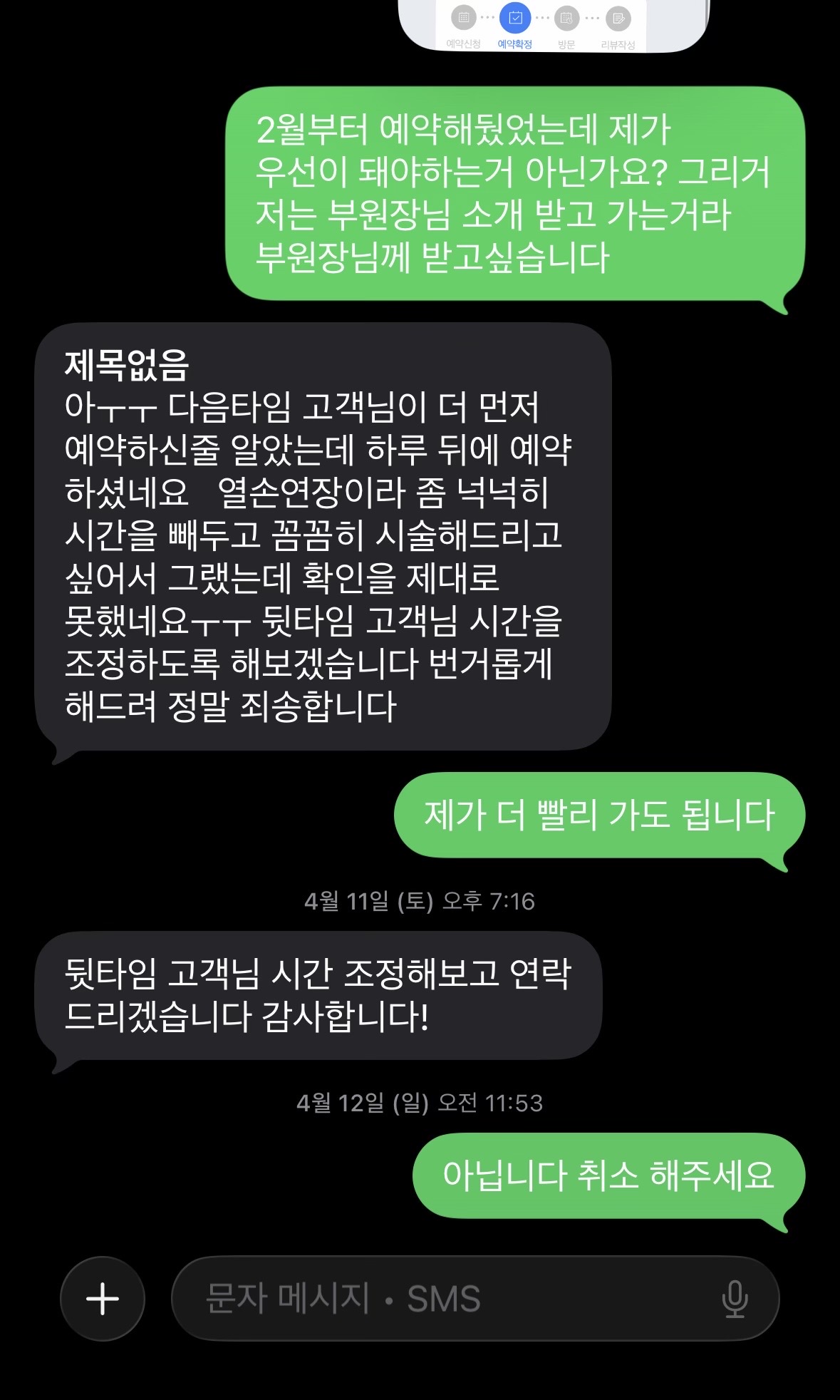 9년 일하고 5월에 휴직을 하게 돼서 1일에 바로 네일 하려고 2월부터 예약해놨는데 저 ㅈㄹ 심지어 친구한테 추천받은 곳임 문자 온 전날까지도 5월 1일 네이버 예약 내가 예약한 시간 빼고 하나도 안 막혀있었음 근데 저 문자 오고 다시 확인해 보니까 12시-3시까지였나? 다 막혀있었음 이 정도면 오지 말라는 거 아니냐며 그래서 취소함 시댕 직종이 네일을 하면 안 돼서 정말 설레는 기다리고 있었는데 흑흑