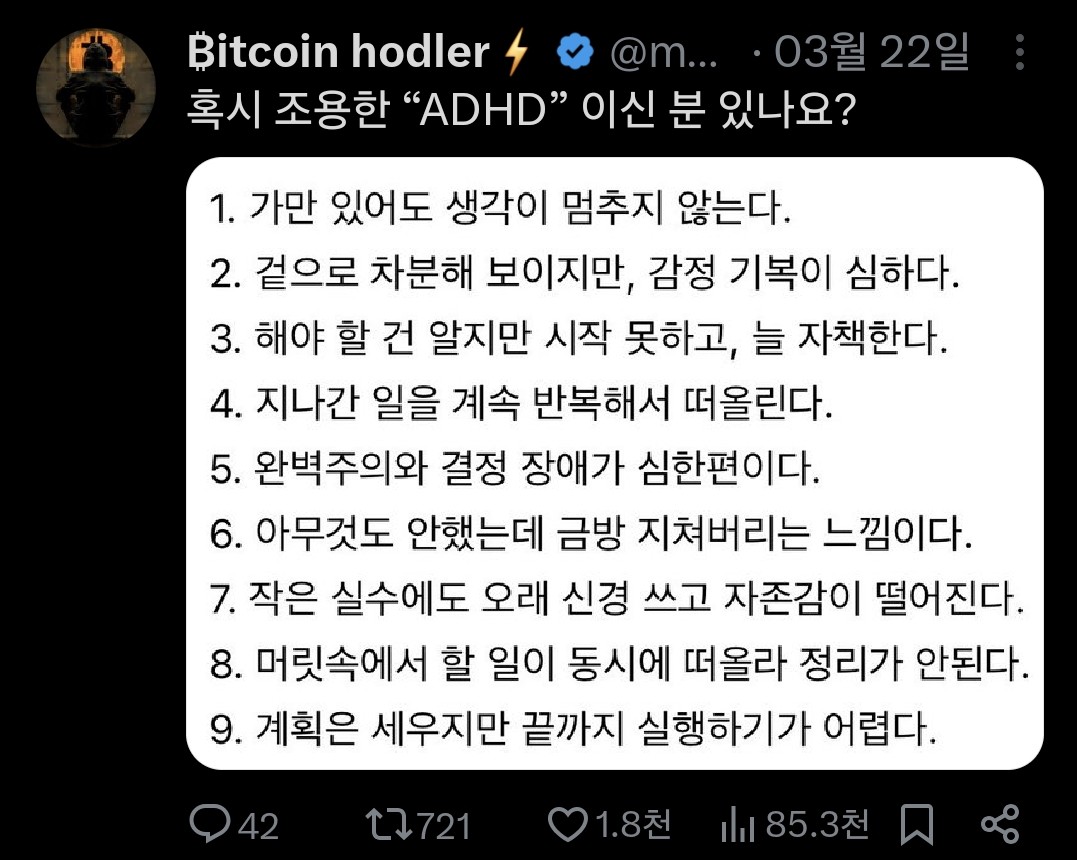 나 8번빼고 다 그럼 그래서 adhd약먹고있긴한데.. 약이 약해서그런가 효과가 미비해