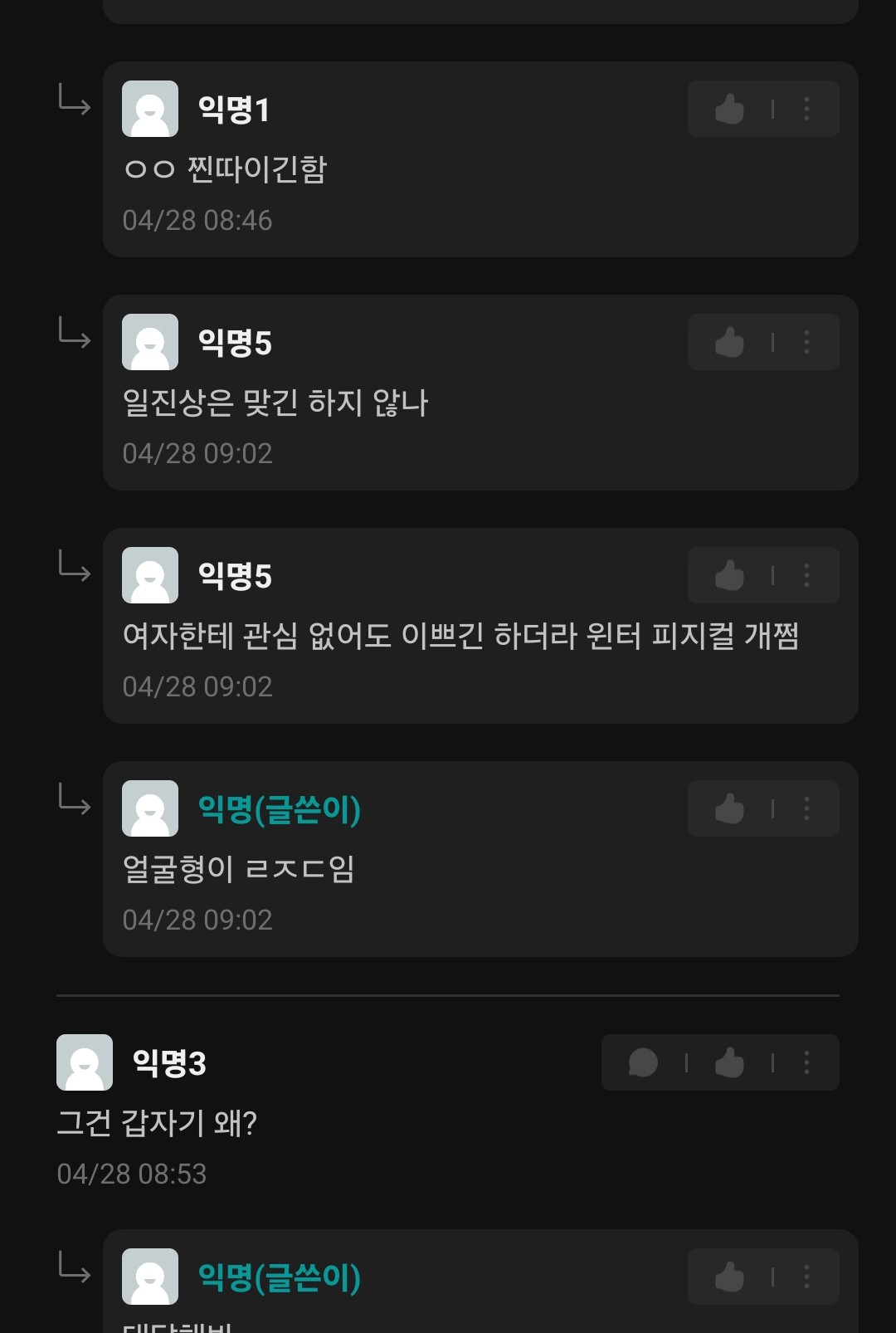 실시간 랭킹1언니들 중년이 몇살부터야??2382나 사진 보정 넘 심한지 봐줄언니ㅜㅜ2283기독교 무교(불교) 결혼954엄마랑 딸이랑 뽀뽀 하는거1645카페 사장님이랑 알바가 내 얼굴 기억하심686인스타 팔로우 취소 당황스러운데367예전 남친이 내 손톱 엄지 발가락 같다고했었는데528이 글 말투 뭐가 잘못된 곤지 알려줄 언니589무료타로 타임 !2310내가좋아하는사람 나를 좋아하는 사람14