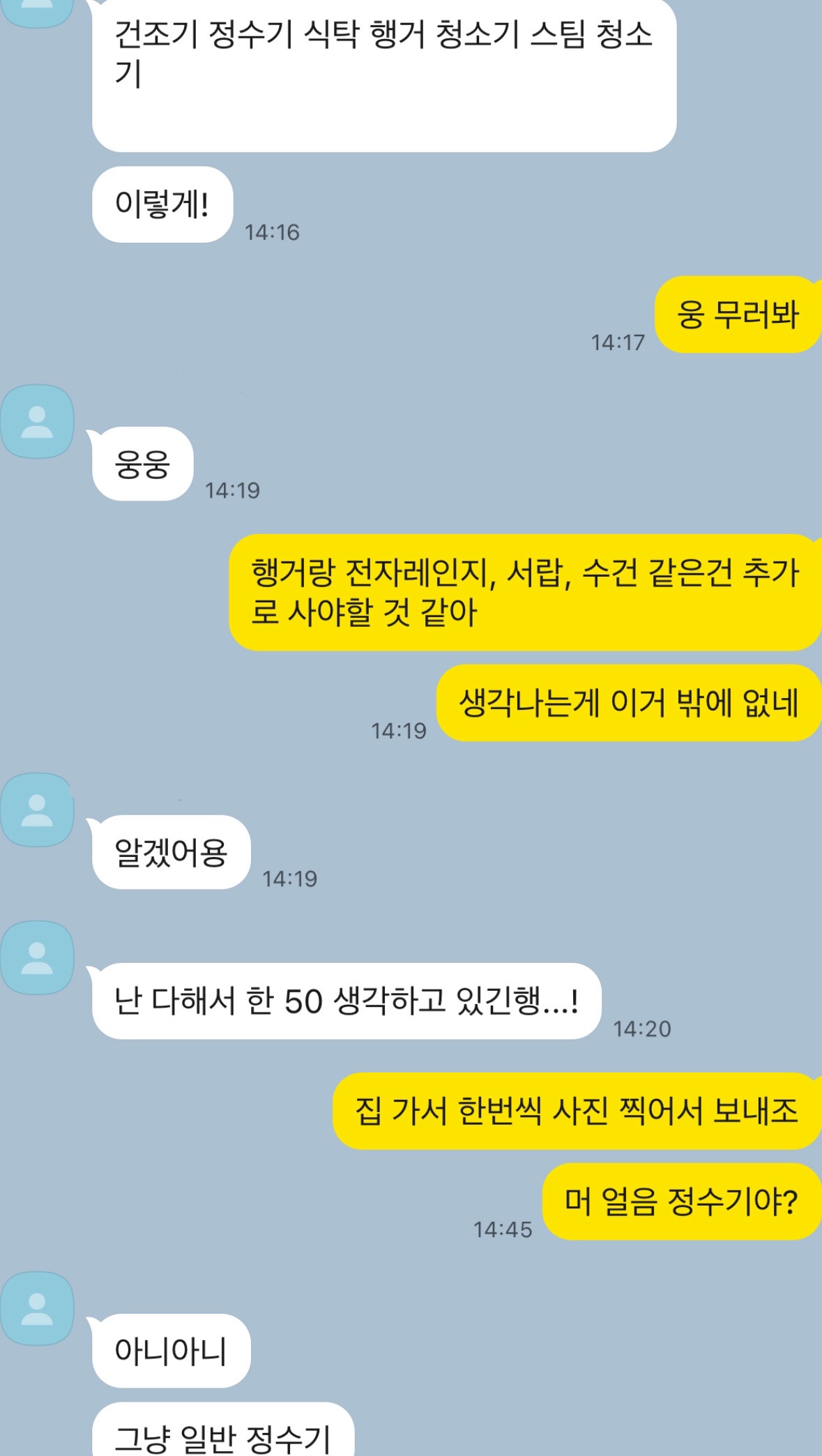건조기, 정수기, 식탁, 행거, 청소기, 스팀 청소기를