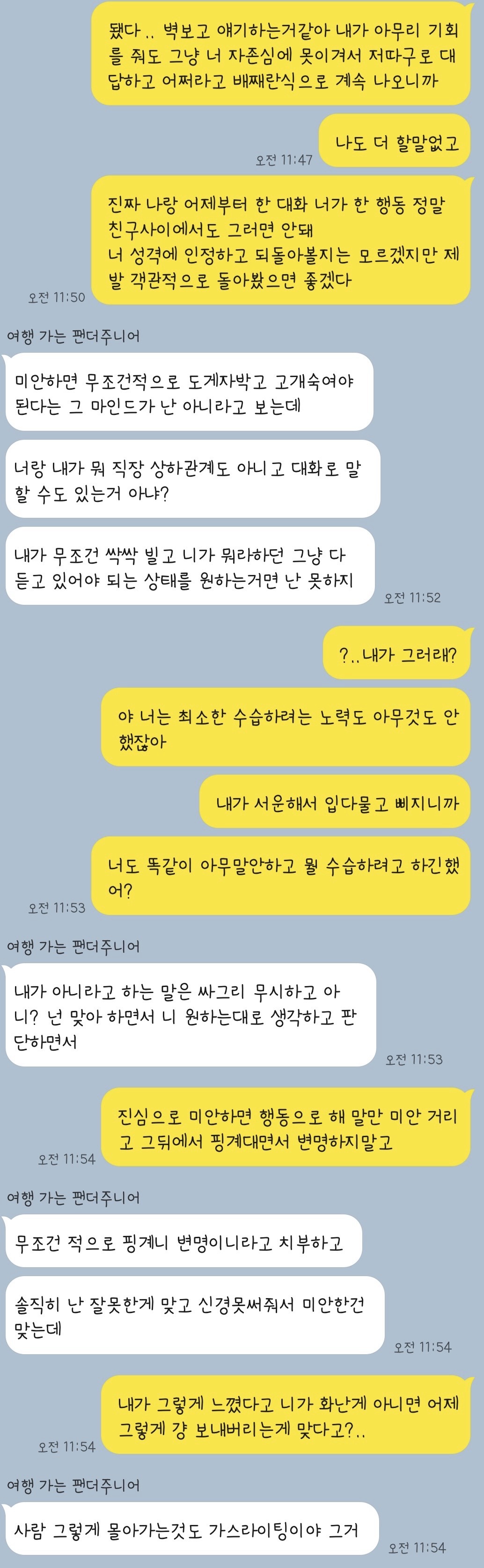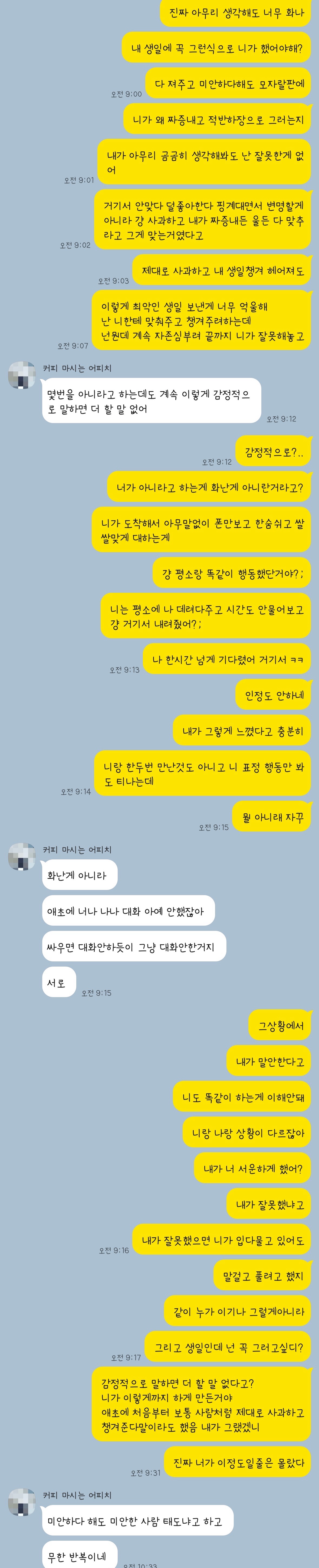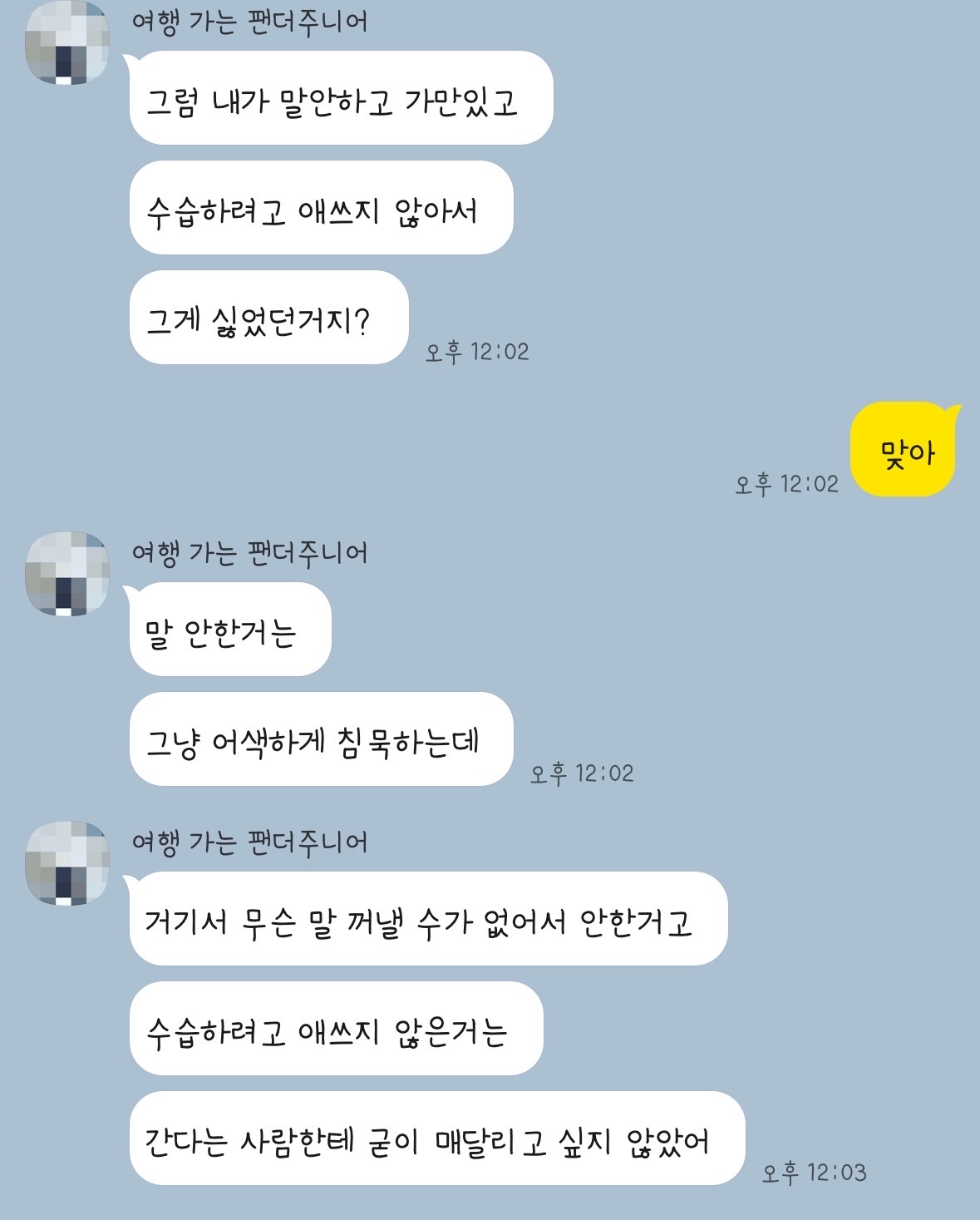 그 후에 카톡으로 길게 보냈더니 자기는 수습하려고 했는데 집오자마자 짐싸서 집간다는거에 실망했대 ㅋㅋㅋㅋ
