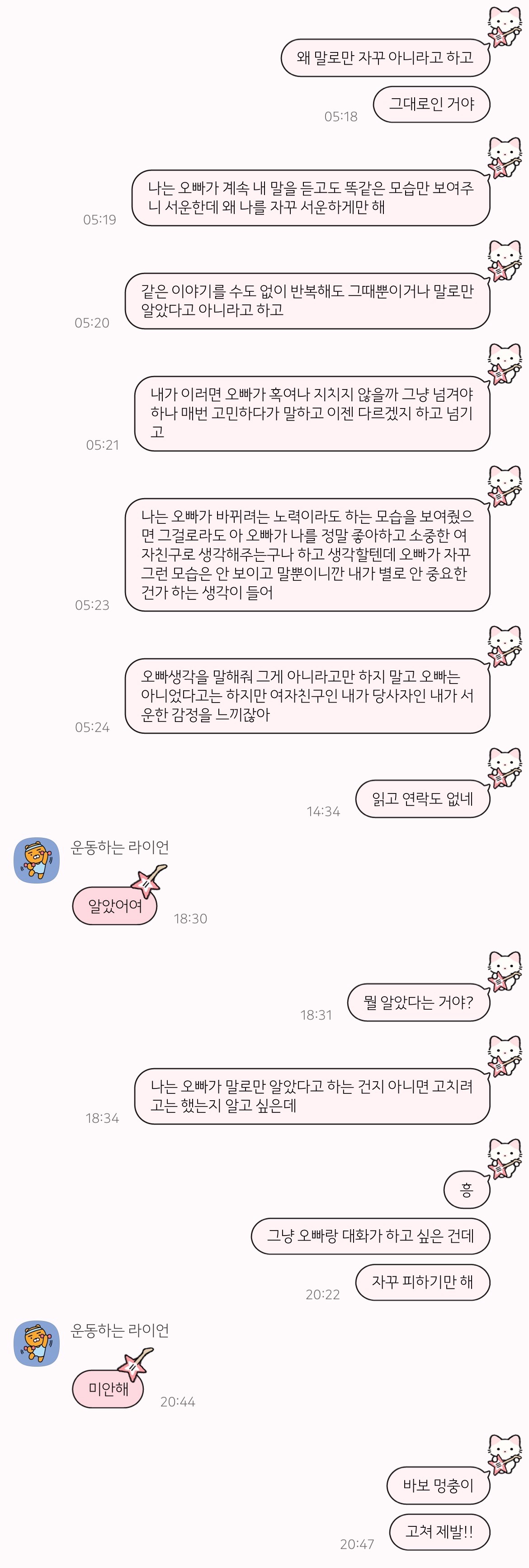 썸을 살짝 길게 타다가 사귀었는데 남자친구가 내가 서운한 점을 말하면 장난식으로 넘기거나 그냥 알겠다 미안하다 하고 넘긴 적이 많았어