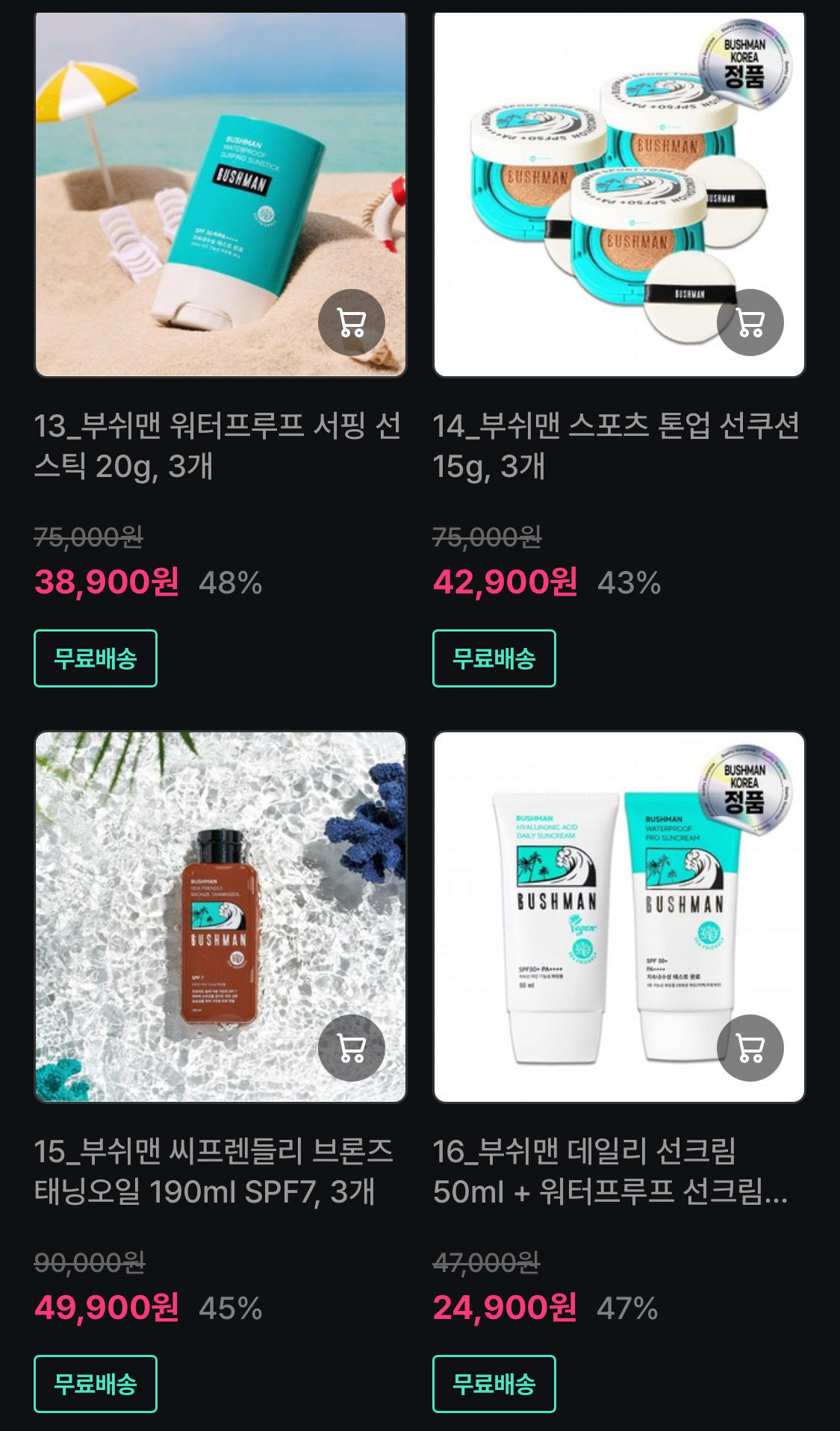 #개이득부쉬맨 워터프루프 선크림,스틱,쿠션,태닝오일 라방할인해 - 속닥