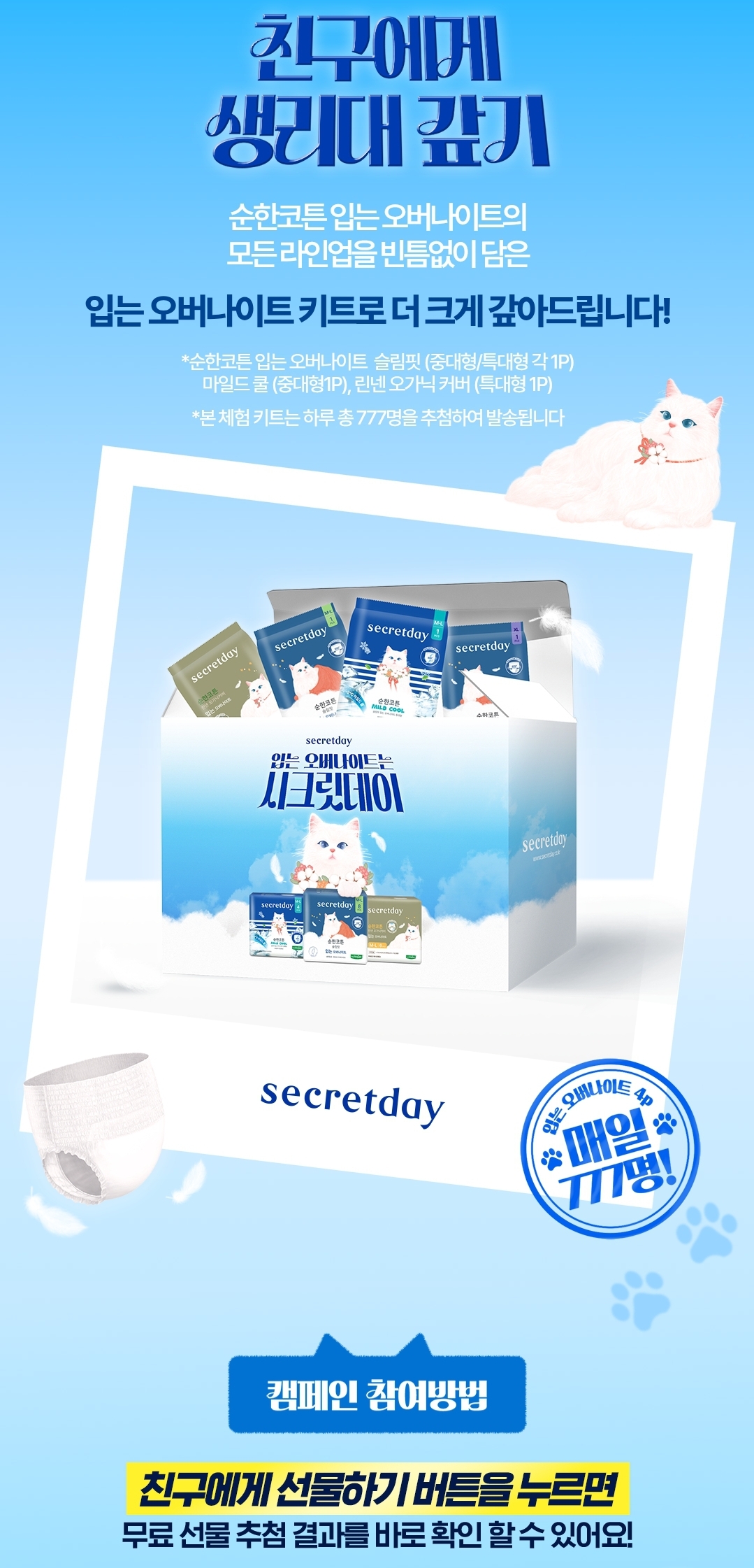 https://m.hbox.kr/secretdaydream/당첨되면 친구한테 입는 오버나이트로 준대하루에 777명 당첨이고공유하면 기회 더 생긴다당첨된 사람이 주소입력하는거라서 선물주는사람 주소 몰라도됨!