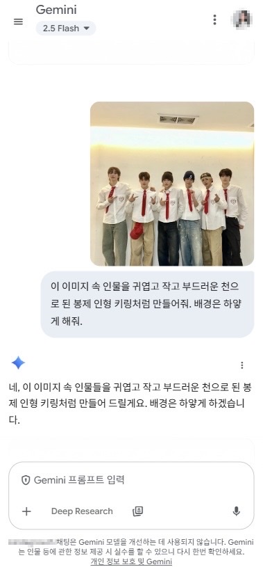 제미나이 이미지 생성하기로에 원하는 사진 골라서 프롬프트 이렇게 쓰면 인형키링 만들어줌ㅎㅎ아 진심 이거 너무 갖고싶다 ㅠㅠ