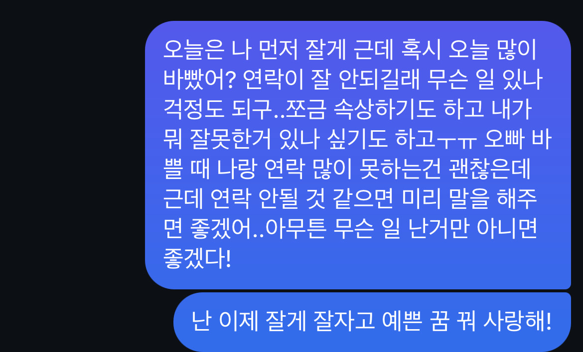 +망했네 저거 보내기도 전에 일어나서 타이밍도 못잡음 피곤하다고 계속 그러고 먼저 잔다고 잘자라길래 그냥 그래 잘자 사랑해 이래버림..애정표현도 안하고 잘자라길래 짱나서 나도 안할까 하다가..ㅋㅋㅋ…저거 써둔건 언제 보내냐..솔직히 오늘 좀 심했어 남친 연락텀..