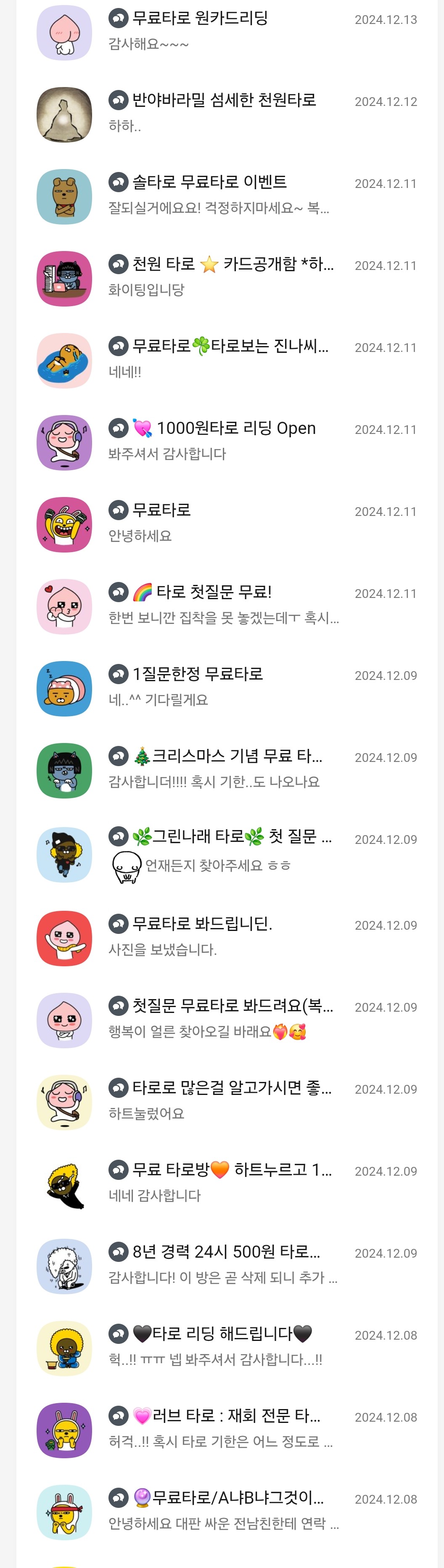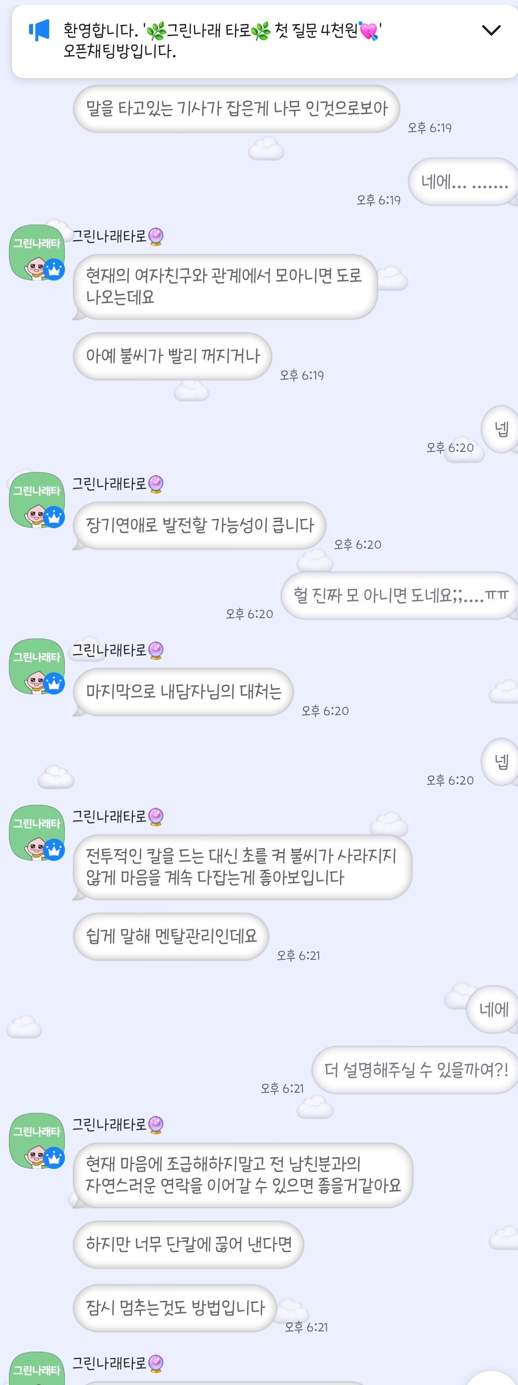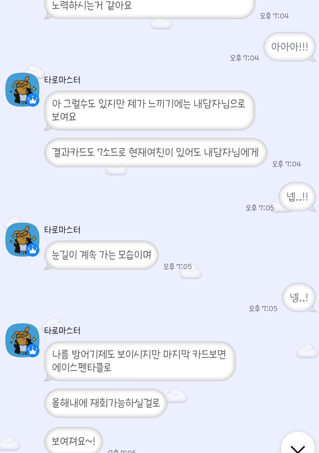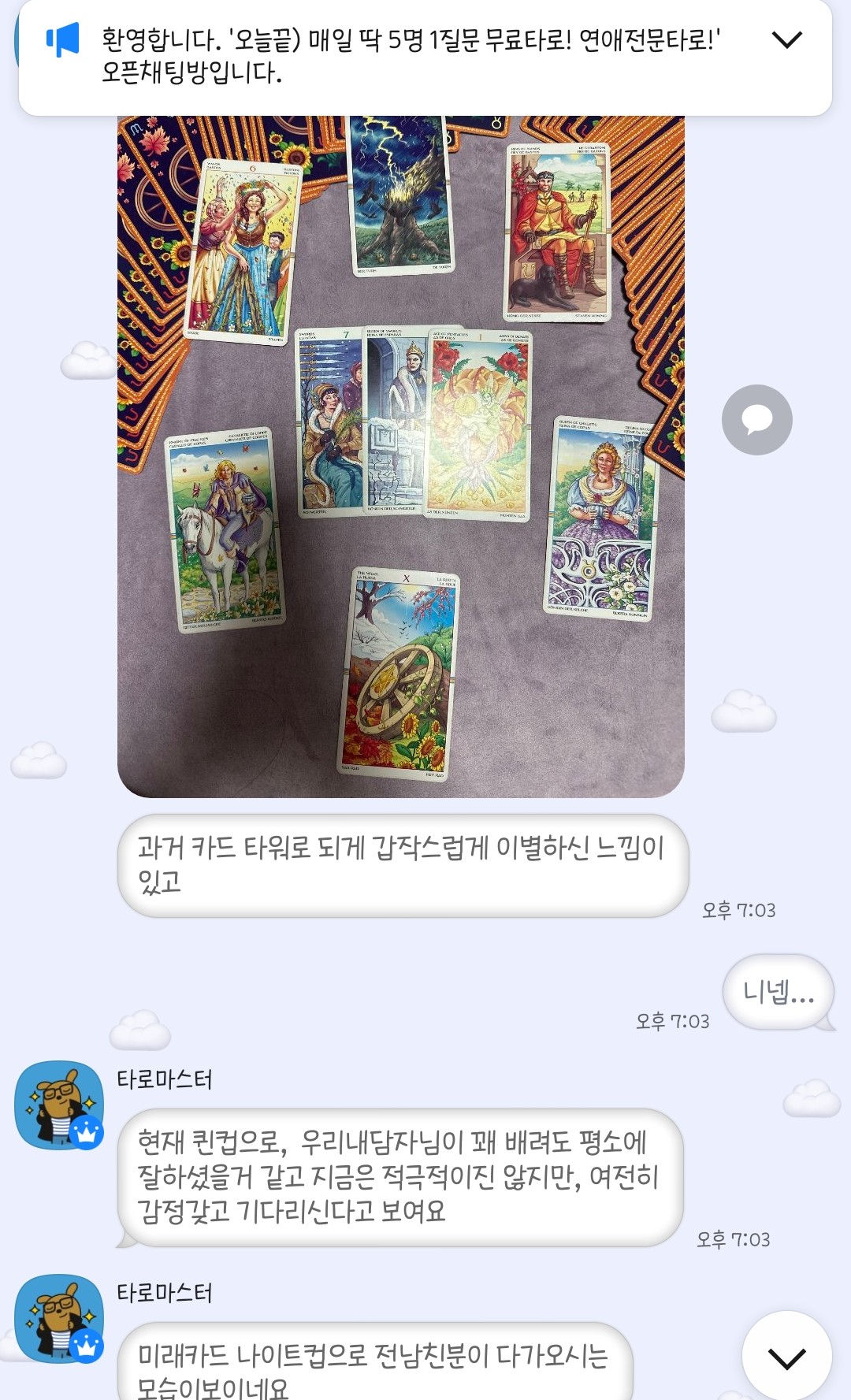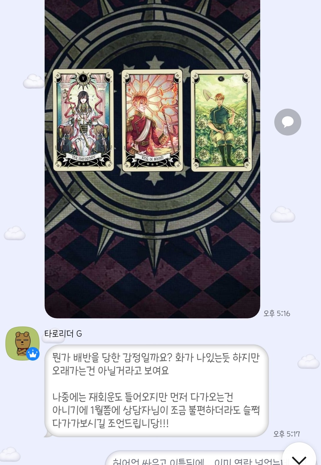 전남친이랑 헤어지고 미쳐서 타로 엄청 봤는데 30-50개 될듯? 결국은 거의 다들 다 틀림 저 무료 타로들도 첫질문만 무료지 추가질문 돈 받고 하는 유료타로였움 그땐 도움 안됐는데 그나마 지금와서 생각해보면 좀 맞다 싶은거 있고 그나마 뽑아보자면 두개? 젤 잘 맞는거 같은데 방을 못 찾겠음(밑에 사진 첨부한 거)