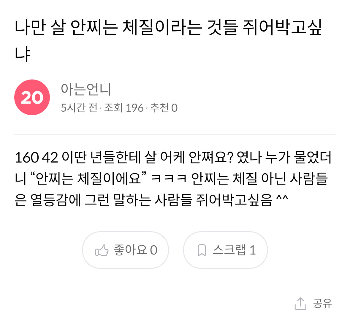 실시간 랭킹1친구 한명도 없는거 문제있는거야??3252내 마음이 잘못된건가? 진짜 못된거야?1473이정도면 솔직히 못샹긴건지554내 외모 평균 이하인 걸까??ㅠㅠ1425사진골라줄 언니들996참 피곤하게들 산다157하이라이트 테마 뭐가 더 이뻐 ??48야쿠르트 하는20대있어?159재수생인데 부모님 카드값때문에싸우고16310키스 몇번해?26