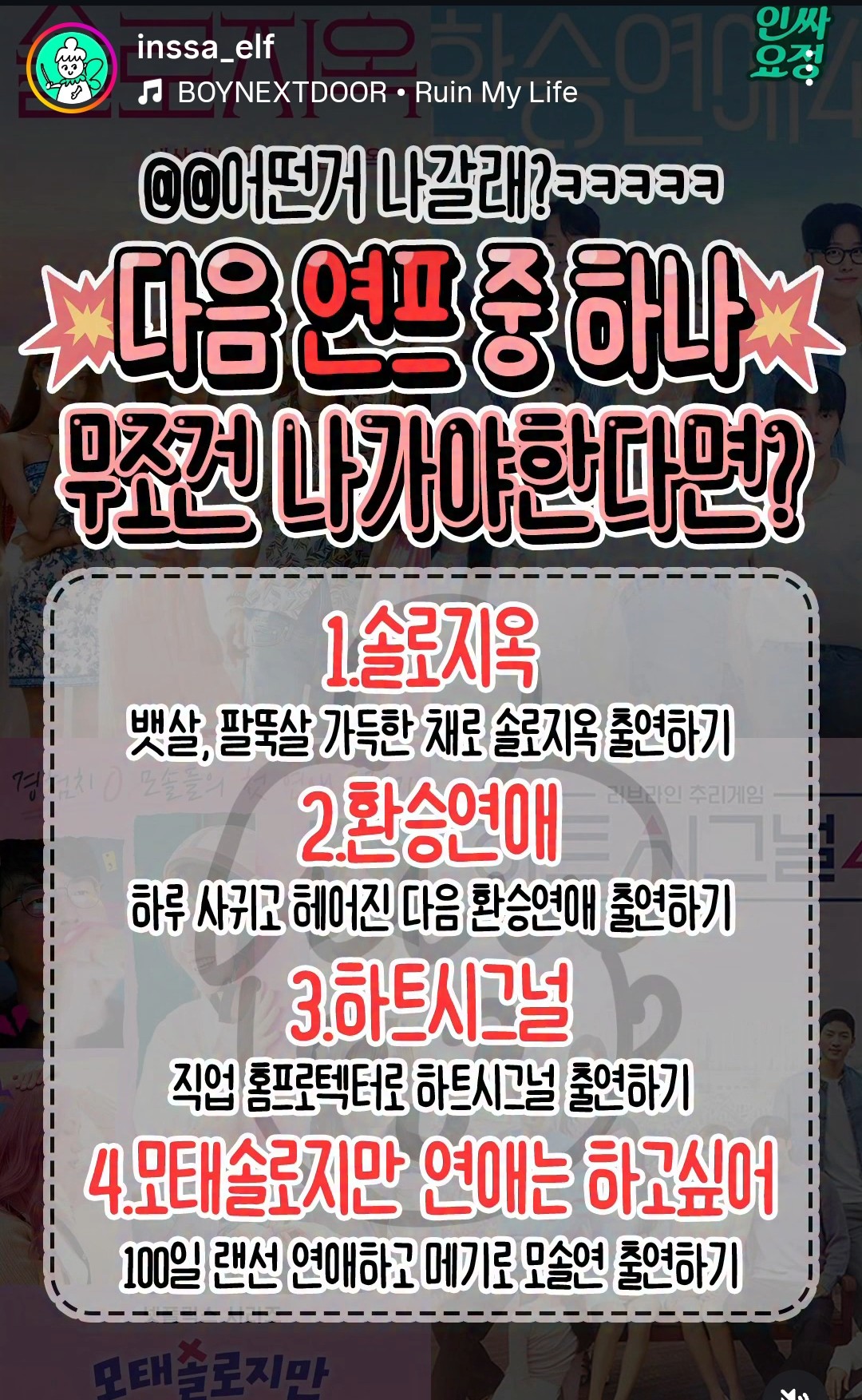 인스타보다가 급궁금해졌는데언니들은 연프 나갈수 있다면 어디나갈거?이유도 댓으로 달아쥬라.난 참고로 3번 나가고 싶은데하트시그널이 뭔가 차분하게 설레는게 있는듯.나머지는 너무 스트레스 받을거 같음...1. 솔로지옥2. 환승연애3. 하트시그널 4. 모태솔로지만 연애는 하고싶어