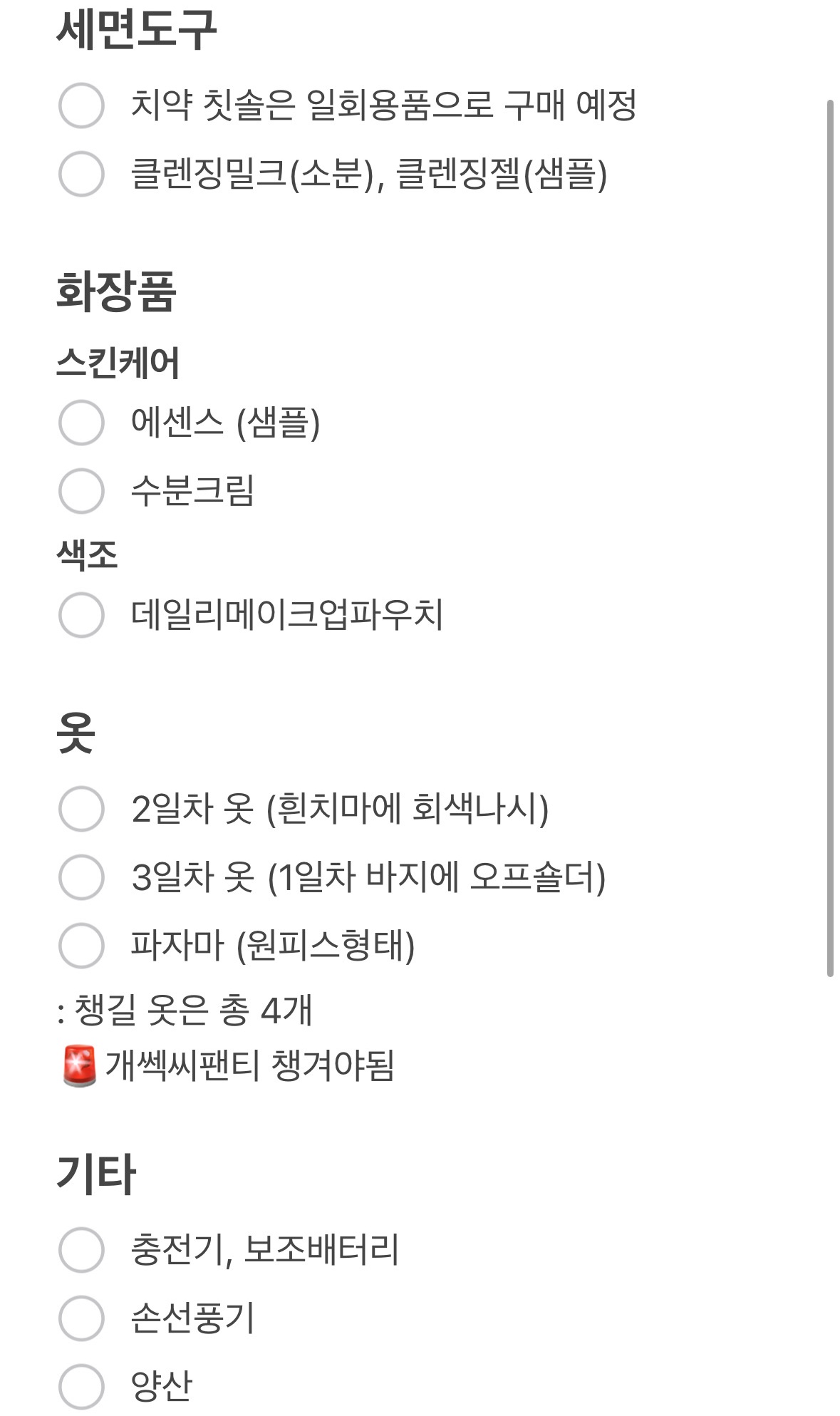 글쓴이@아는언니1 헉 고마워🥺🥺 소분한 향수랑 가글을 왜 잊었지!!😱 쿨패치는 남친한테 가져오라구 해야겟다 내 가방 터질듯 난 애초에 화장을 진짜 연하게 하고 다녀서….한동안 피부관리에 진짜 힘쓰려곸ㅋㅋㅋㅋㅋ 혹시 모르니까 피부과에서 약도 처방받구.. 뒤집힐 수도 잇자너