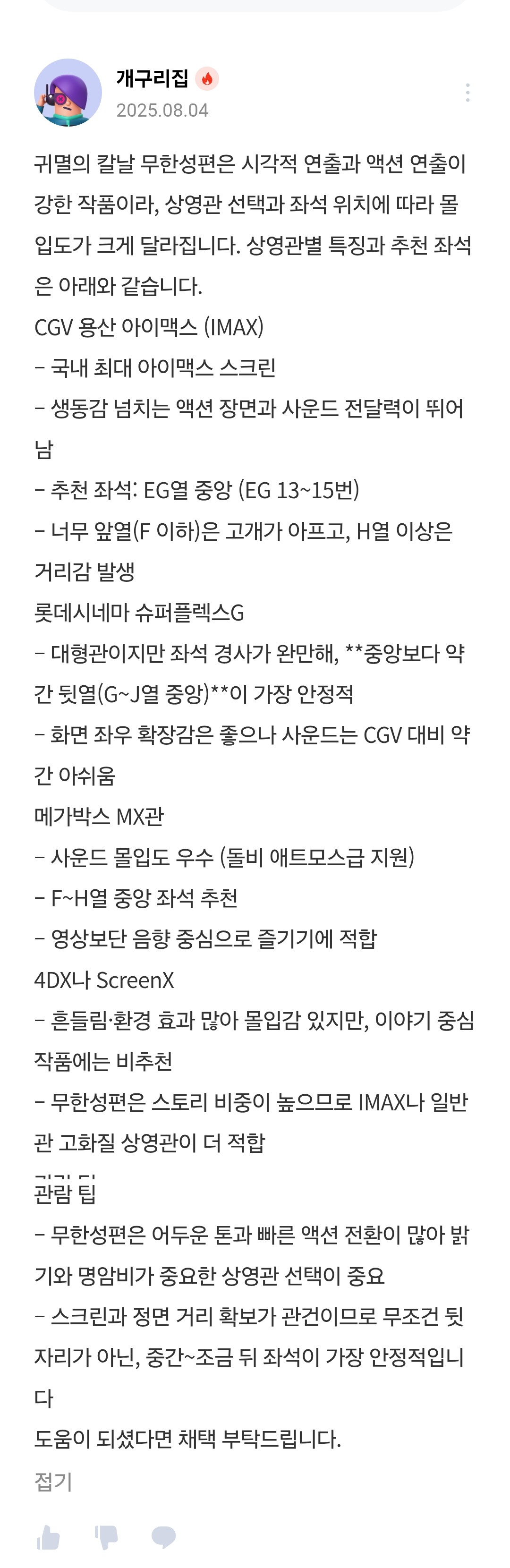 언니들 나 방금 귀칼 보고 왔는데 ㅠ너무 재밌어서 낼 더 좋은 상영관으로 볼 예정이야. 언니들도 이거 보고상영관 잘 선택해서 가봐봐아 진심 개재밌어서 아이맥스로다시 보고 싶어졌어 재밌어서 엄청 몰입하고 또 광광 울었어