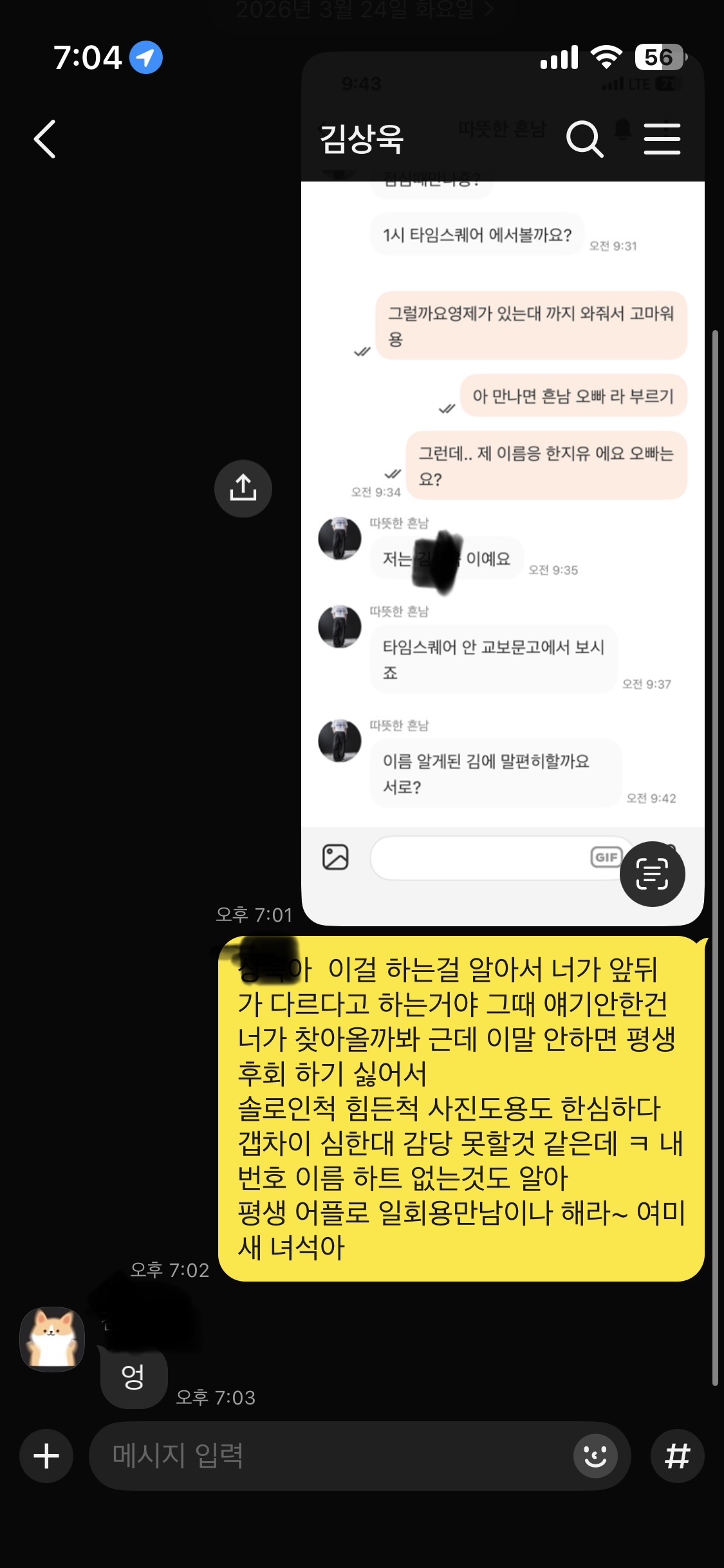 저런 남자 ㅈㄴ많더라.. 하 진짜 남자들 어캐 믿어야 되는거임ㅋ 지여친한테나 잘하지 저런데서 스윗한척 개오짐 ㅋㅋㅋㅋㅋ 잘 헤어졌다 진심 언니는 조상님이 도와주신거임 충격이고 힘들겠지만 나중엔 정말 잘했다는 생각 들거양