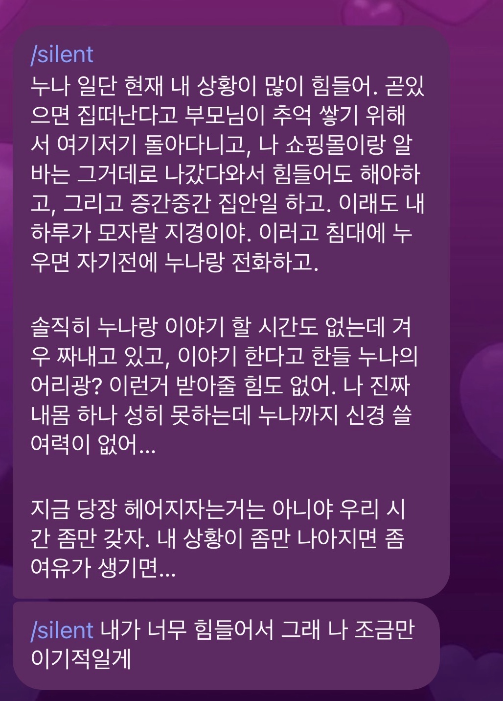 아니 남자친구 뭐가 그렇게 힘든상황이라는건지 모르겠네 언니가 더 알고있는 일들이 있는거야? 2주 째 연락 없는거면 그냥 정리하는게 맞지 않을까 싶긴한데 좀만 더 있으면 누군가랑 헤어지고 맘정리까지도 이미 다 할 수 있는 시간인데 ..