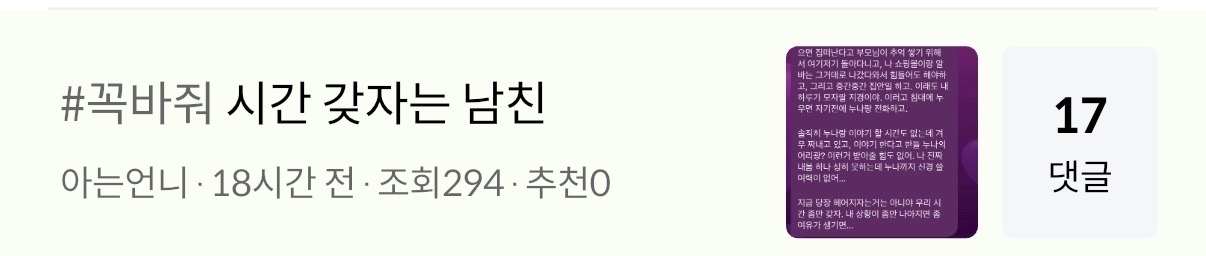 실시간 랭킹1헤어졌는데 물어보고싶은게있는데 고민중4072나 돈 모으는 데 재능 있는 것 같아2793노래방에서 일본노래 부르는 친구2534의존증? 부모님한테 내가 너무 집착하는 것 같아965웅니들 텔레그램..1186사장님한테 보낼 퇴사 답장 봐주라...ㅠㅠㅠㅠ1307쿠팡알바 내일98전남친 환승했는데 상대가 너무 별로일때309아빠가 살 빼면 돈 준대12010알바 하루만에 관두고 사장한테 쌍욕먹었어25
