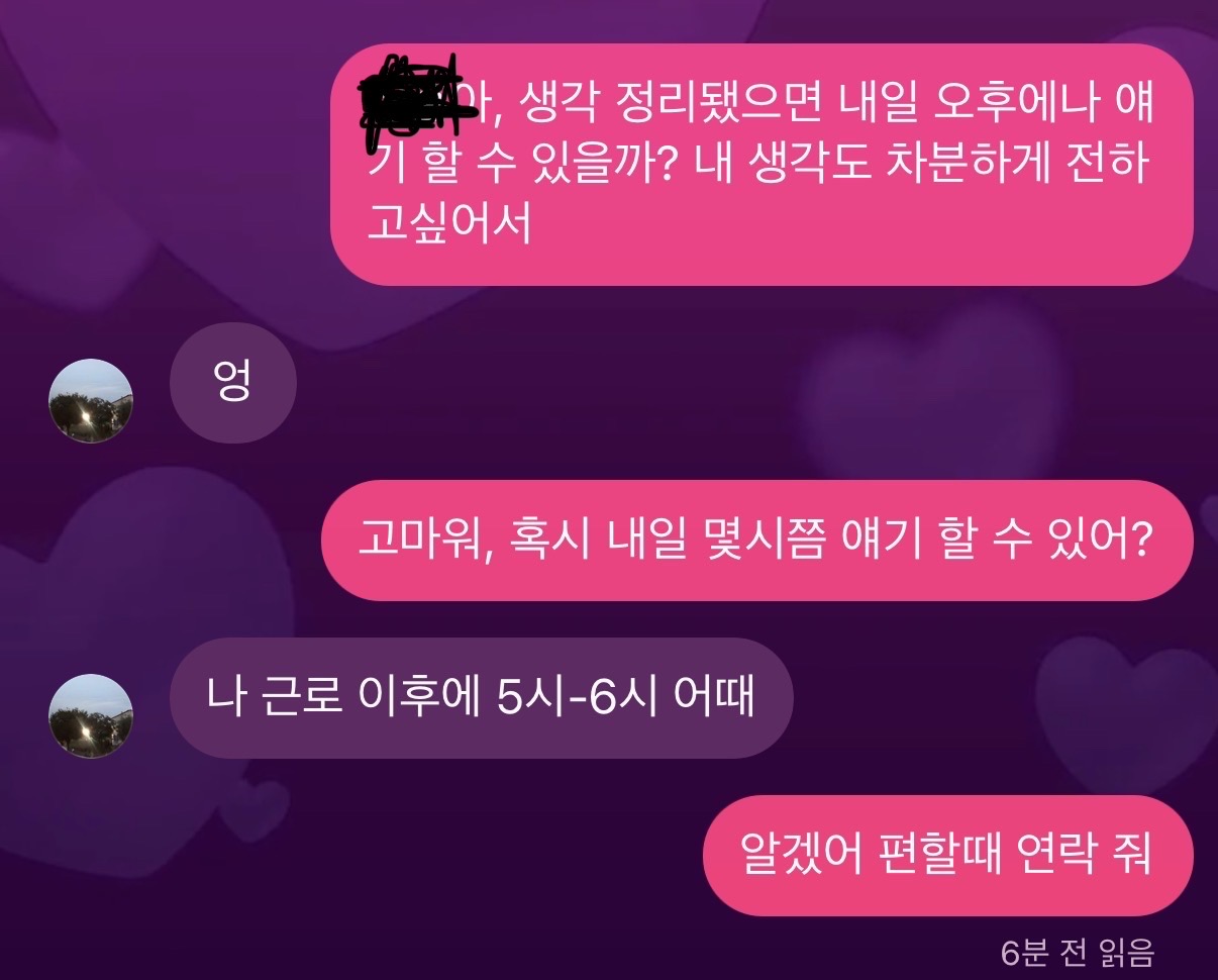 글쓴이@아는언니1 맞아 더 이어갈 노력은 하고 싶은데 상대방이 계속 피하고 그러면 그만 할려고..ㅠ