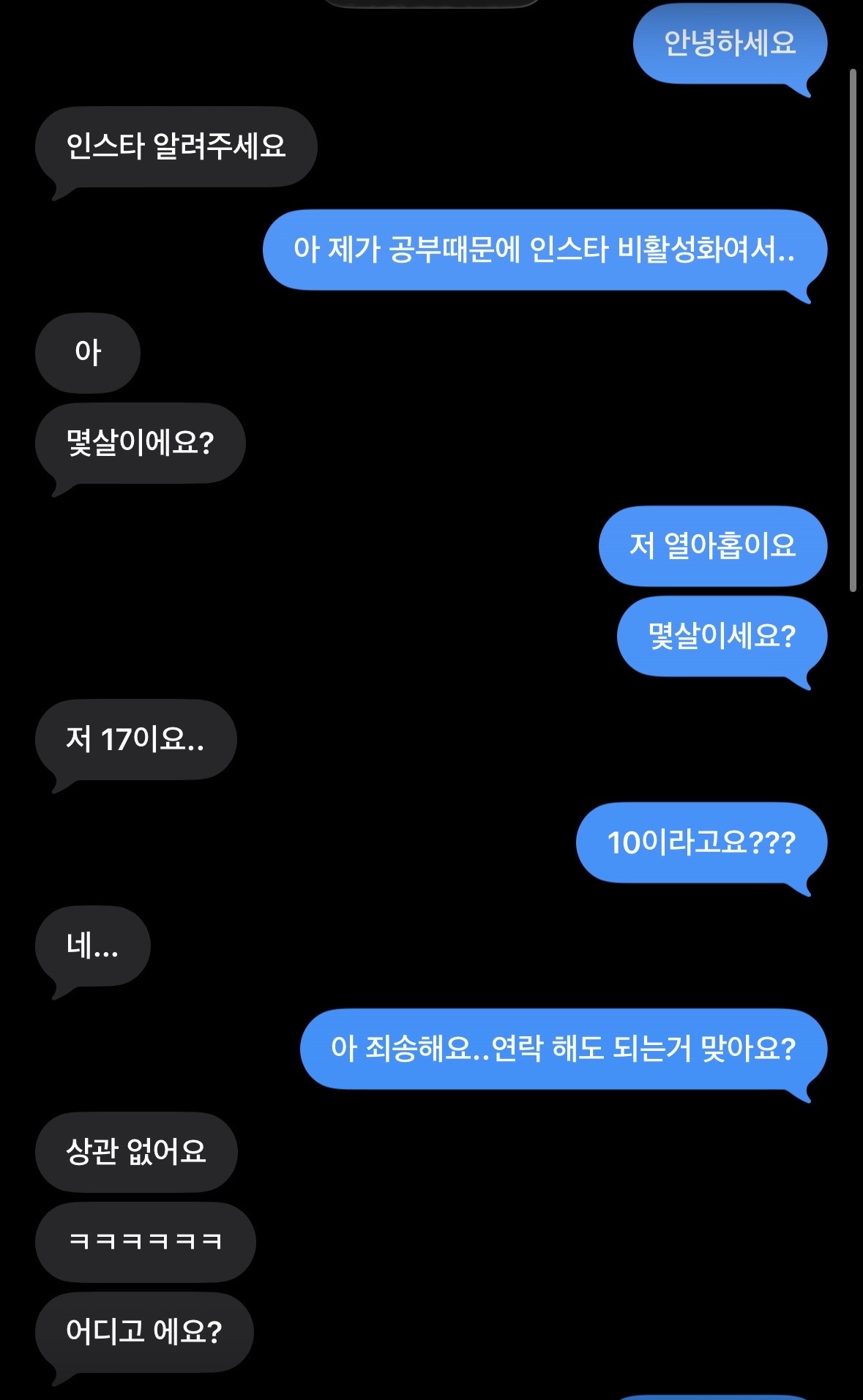 그래서 알겠다하고 바로 문자 갈겼는데 문자에서 보면 알수있듯이 나보다 두살어린거야...진짜 전혀 그렇게 안보였거든???완전 내가 당황해서 연락해도 되냐고 물어봤는데 괜찮다고 해서 계속 연락 하다가 갑자기 얼마안되서 끊겼어....원래 답장 텀 10분에서 5분정도였는데 갑자기 16시간째 안읽씹중임.....
