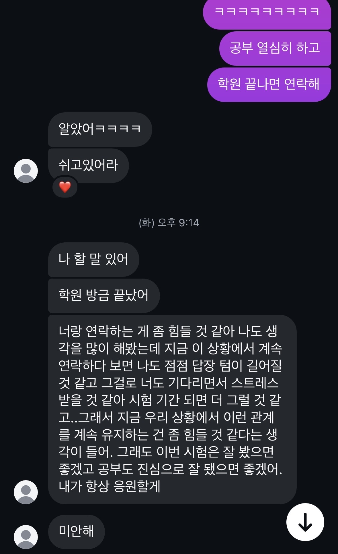 허어엉 ㅠㅠㅠ 너무 슬프다.. 고등학생이야? 중요한 시기인게 맞긴 하지... 이마 저 분도 저 얘기를 꺼내기까지 많은 생각을 했을 것 같애 입시가 끝나고 나서 다시 연락해봐 ㅎㅎ