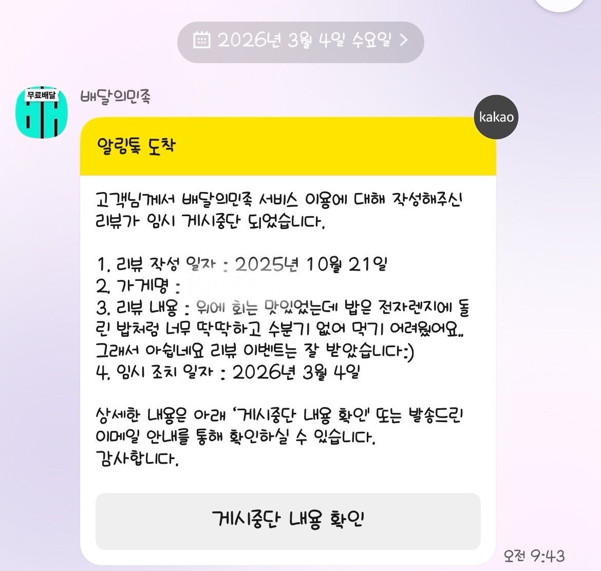참 이게 쉽않 리뷰 이벤트로 뭐 받았으면 보통 좋게 써 주는 게 맞는데 음식이 아쉬웠으니 …. 사장 입장에선 그냥 가리는 수밖에 없지