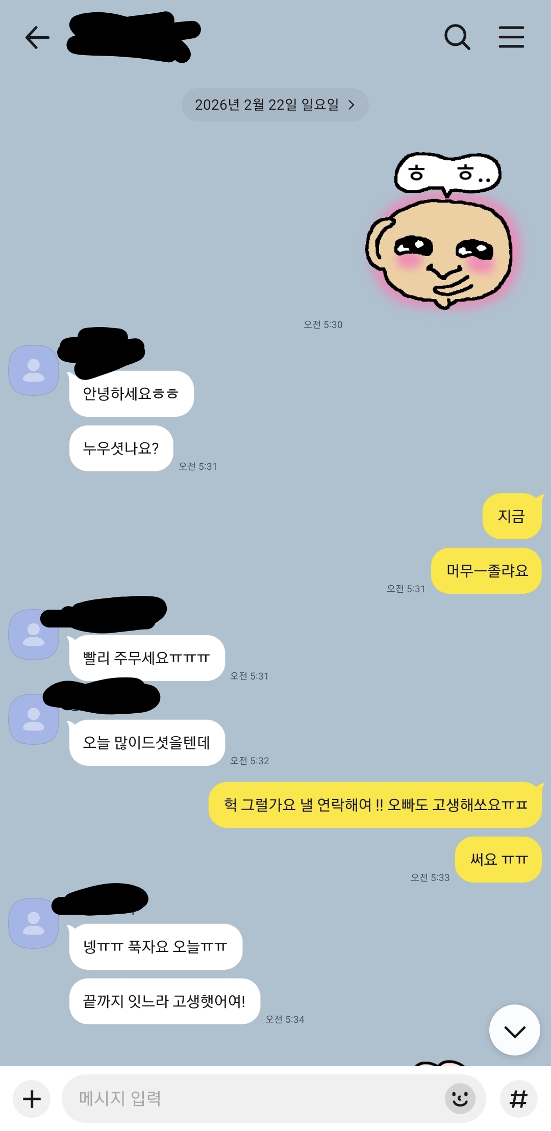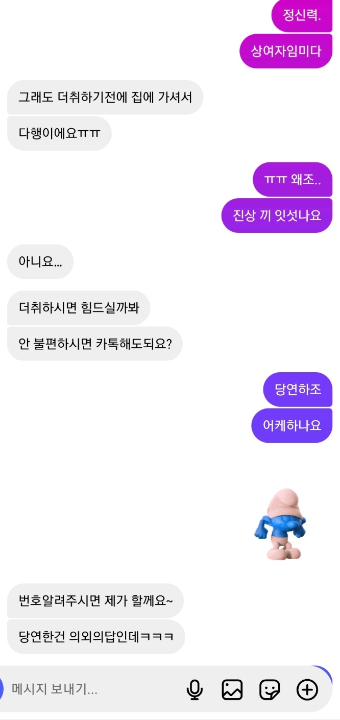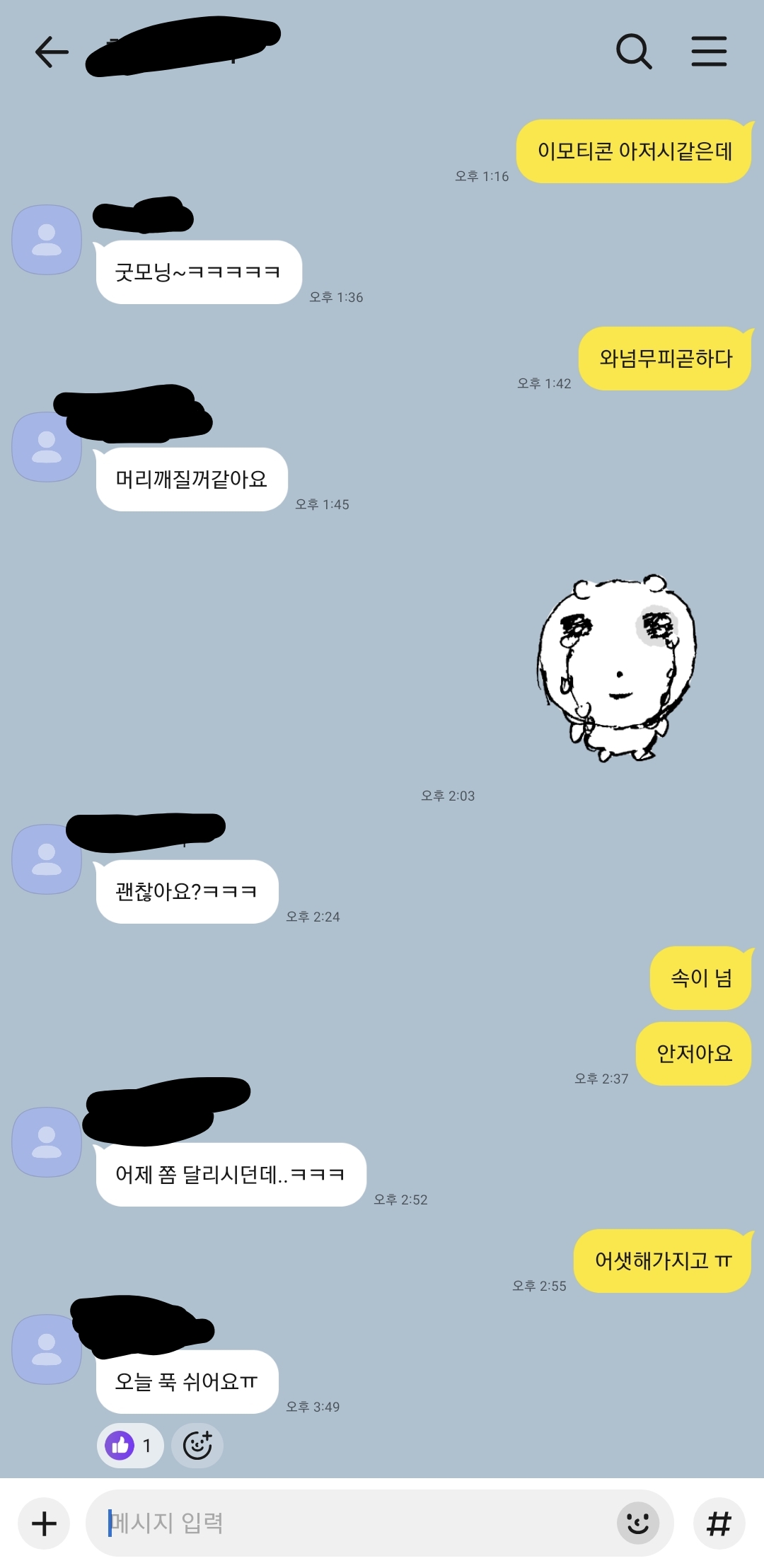넵! 이라고 오고 내가 읽십하고 끝 .. ㅋㅋ ㅋ ㅋ ㅋ ㅠㅠㅠ 발전가능성 없지?