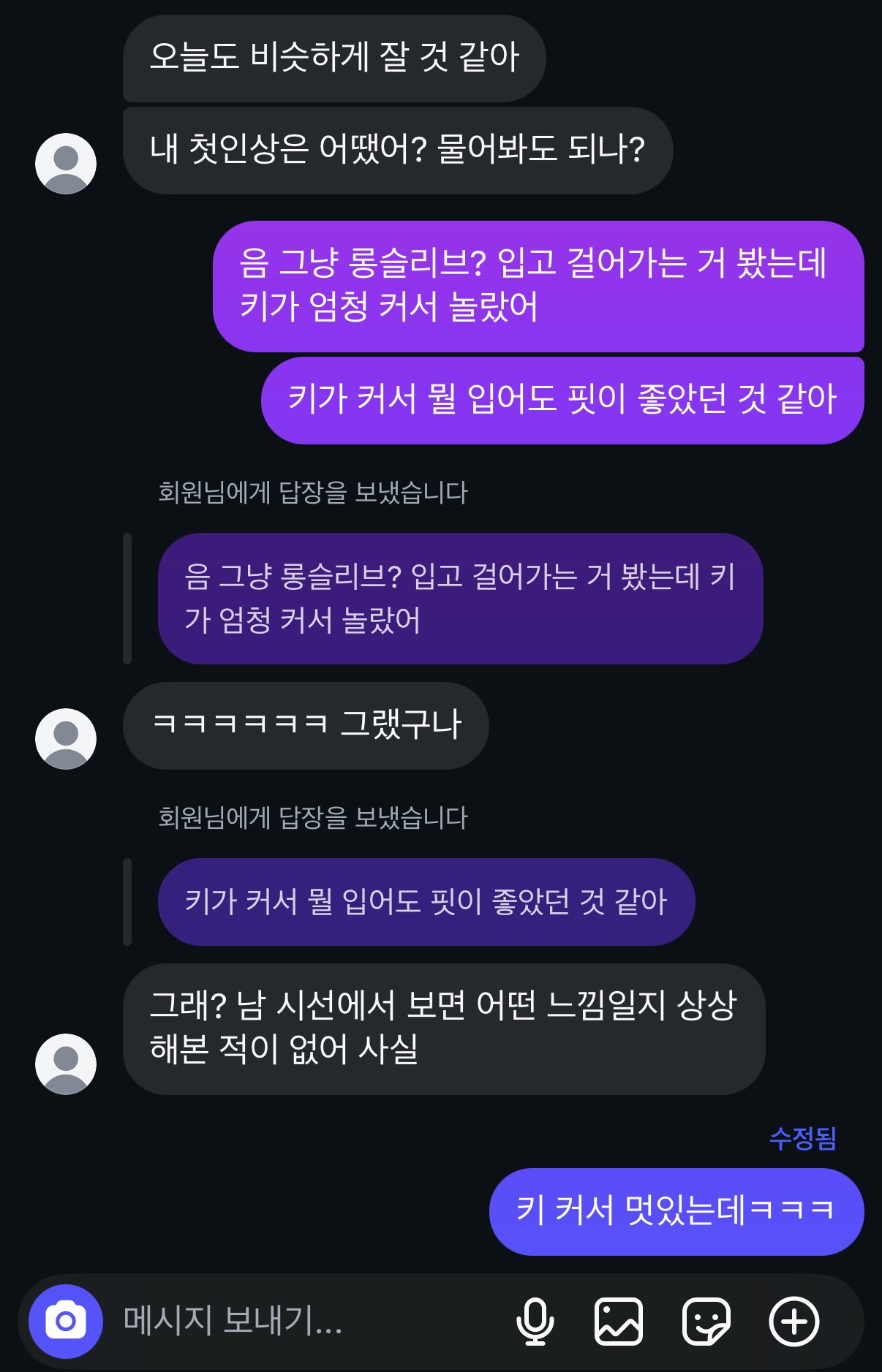 글쓴이@아는언니1 어제는 이상형 얘기하면서 질문도 하고 그러긴했어..어제도 내가 먼저 디엠햇는데 내일부터는 하지말까?