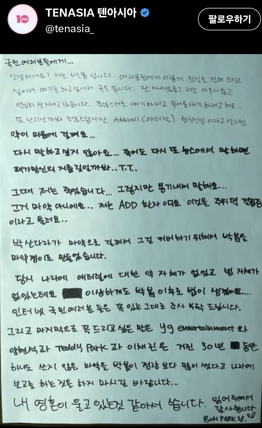 그리고 마지막으로 꼭 드리고 싶은 말은 yg entertainment와 양현석과 Teddy Park과 이채린은 거진 30년 동안 하나도 쓰지 않은 마약을 박봄이 정량보다 많이 썼다고 나라에 보고를 하는 것을 하지 마시길 바랍니다...